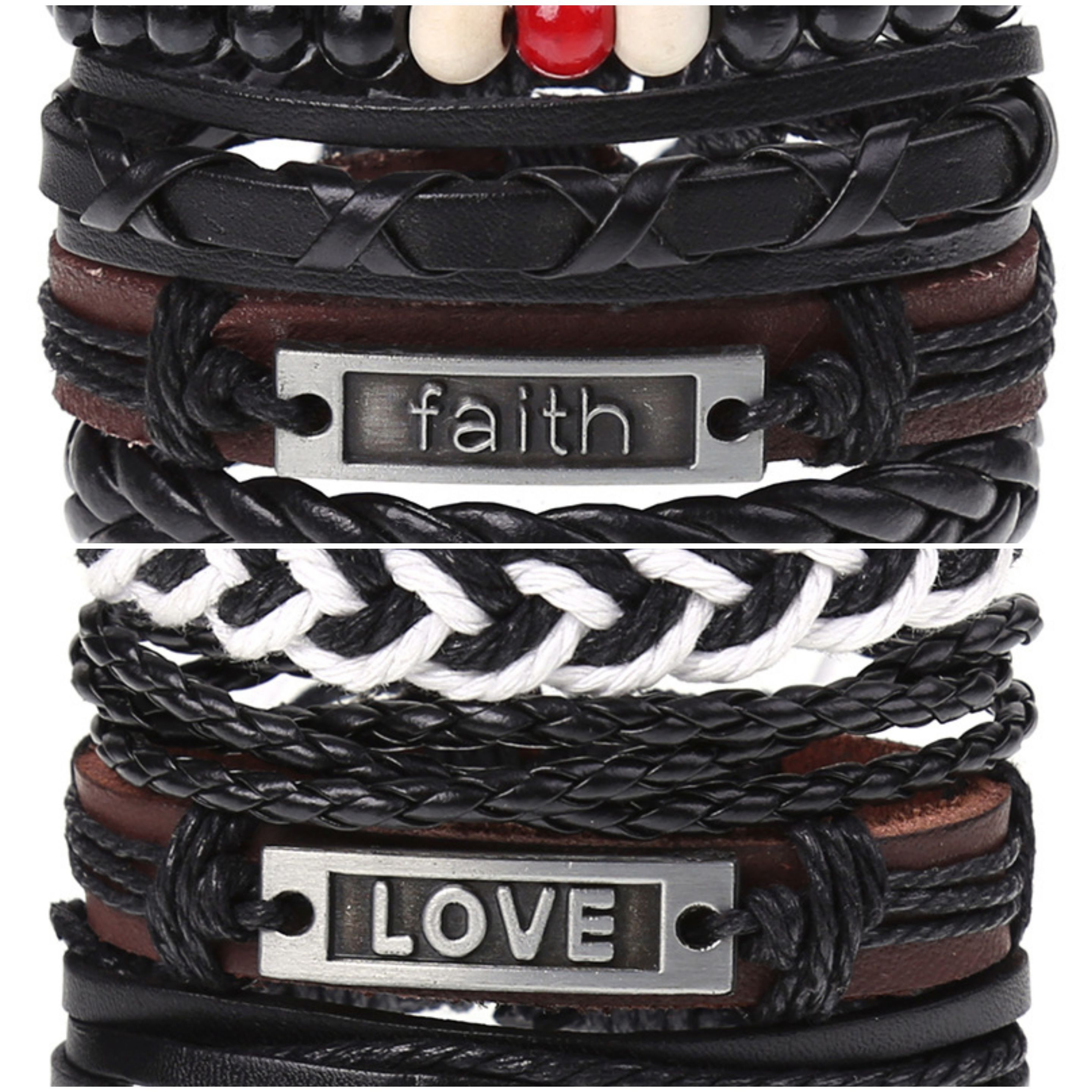 2 x Set Adjust. Size up to 9.5inc Leather Bracelet, (Faith-Love)