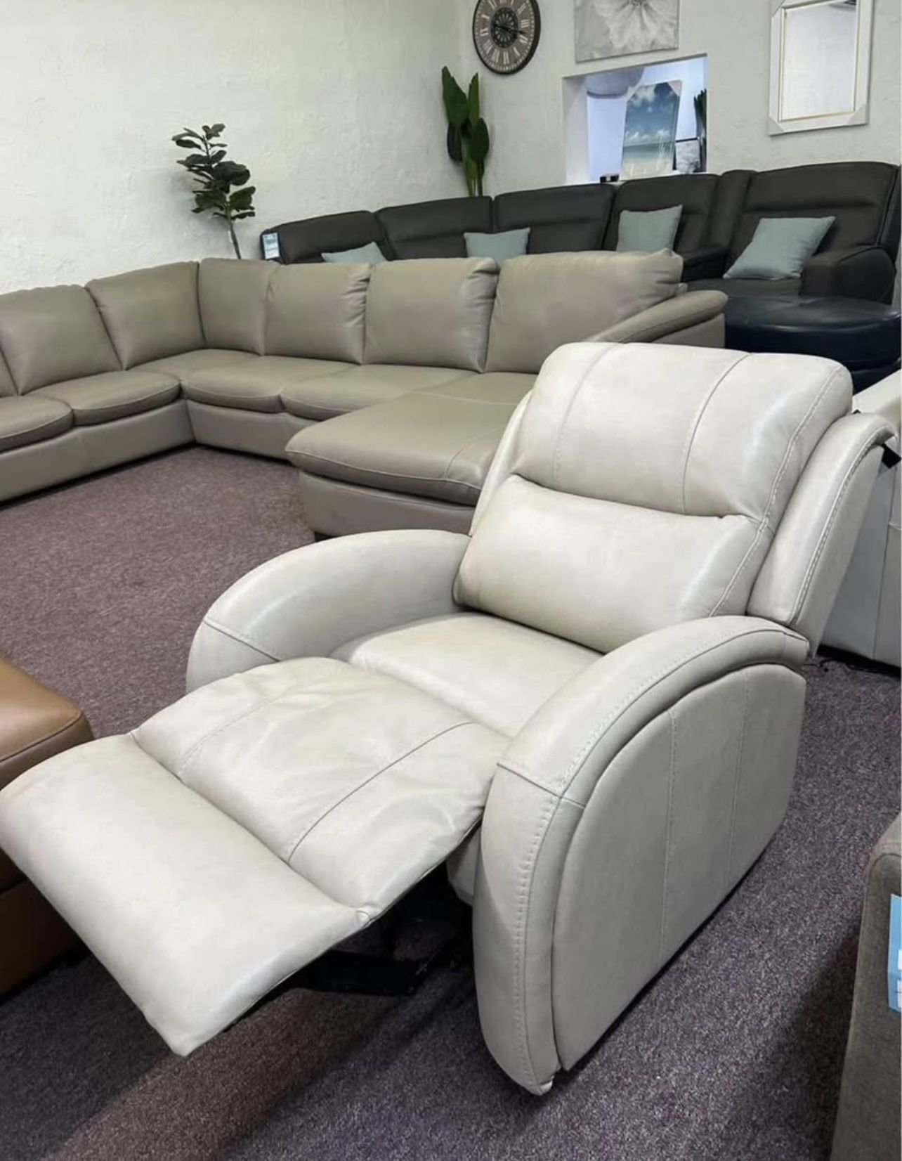 W x 29"D x 34"H Retail price: $1,579 Beautiful recliner that’s even more comfortable and a lot more durable than it’s predecessor the Leiston. The Kellet is firm sitting, more pronounced stitching and a grainy yet smooth leather surface. USB port located on switch panel. Delivery available Financing available Store display item
