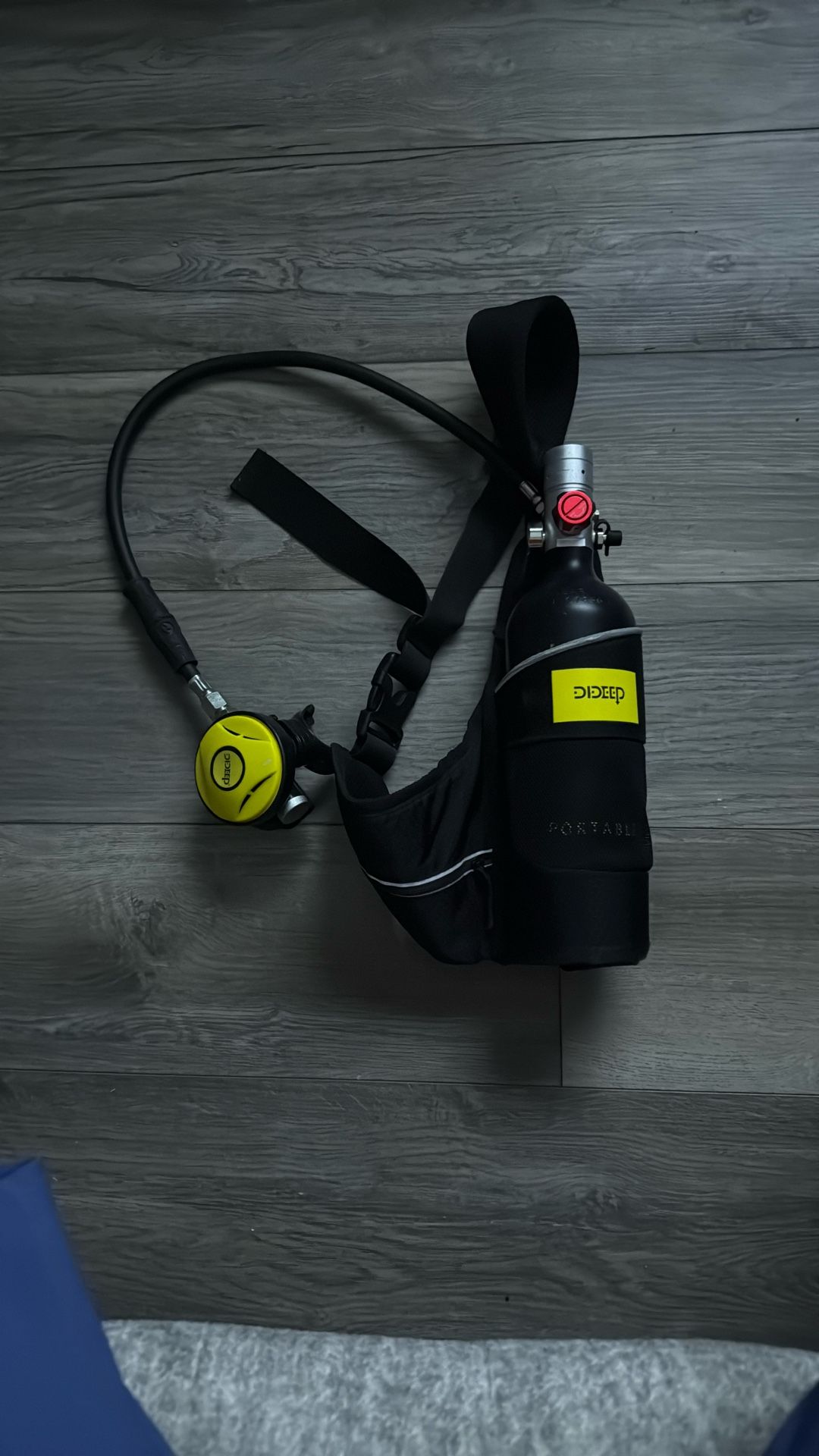 Mini scuba tank, 20 minutes of air, good condition, barley used, works, black and yellow. Scratched on side and bottom not to badly tho.