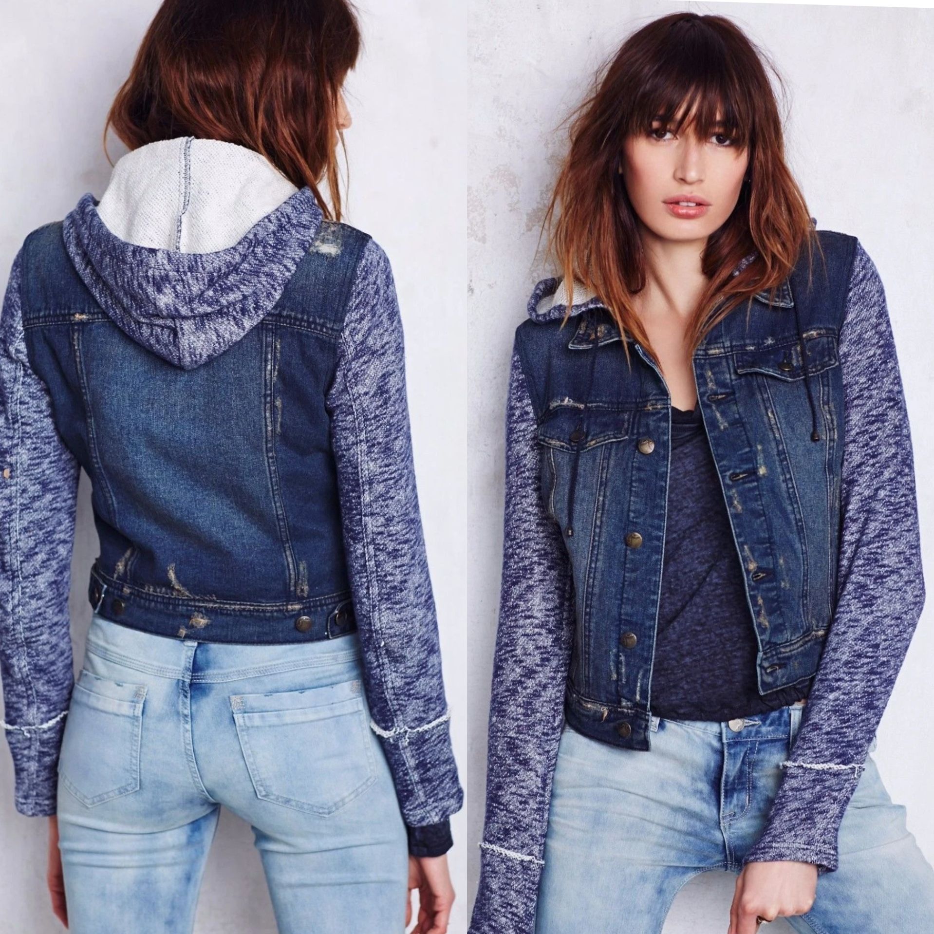 Free People Denim Jacket Knit Hooded Distressed Jean Jacket Womens XS