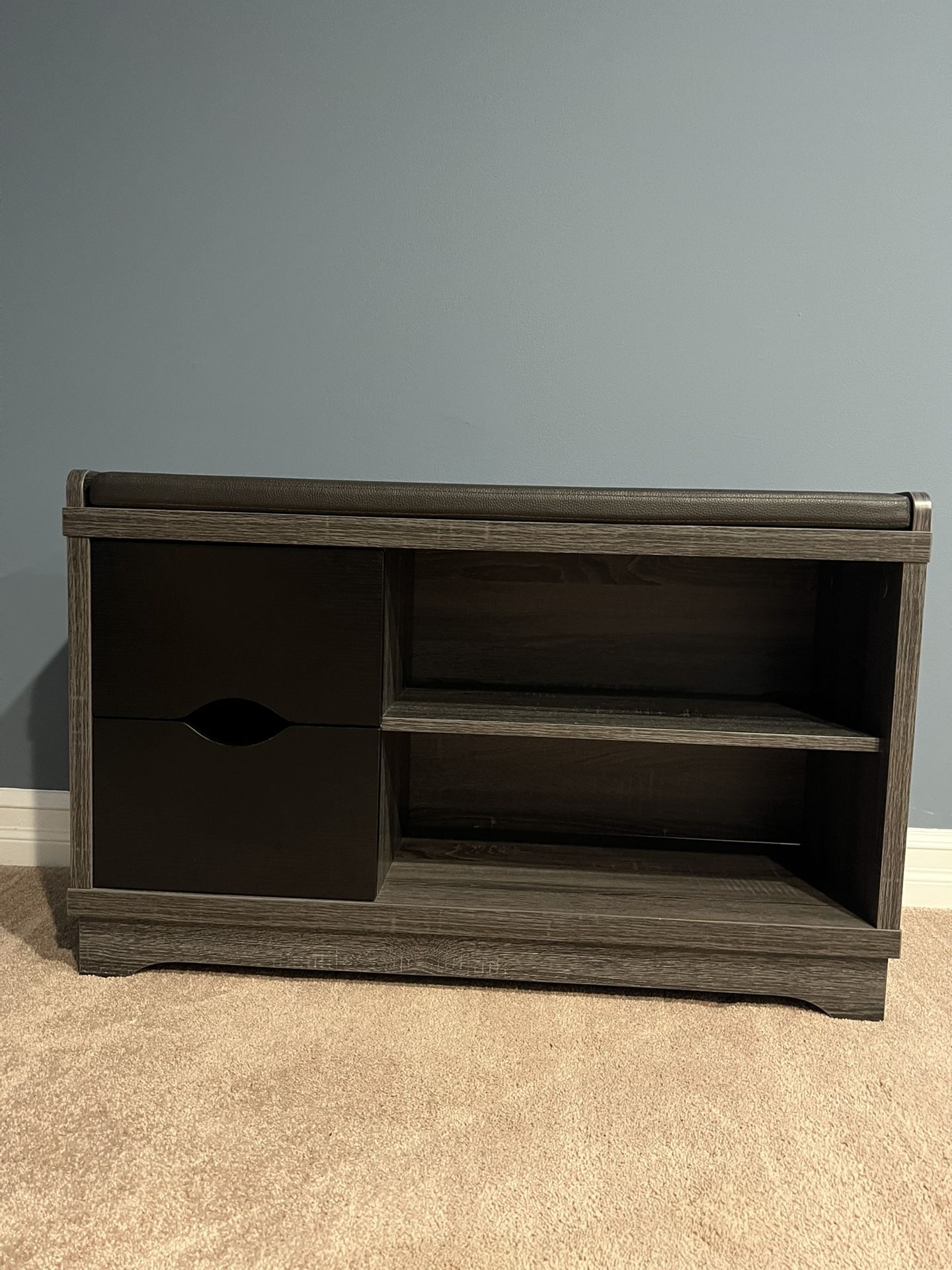 This is a 2-drawer storage bench with a distressed grey and black finish and an upholstered seat cushion. In great condition, looks new.