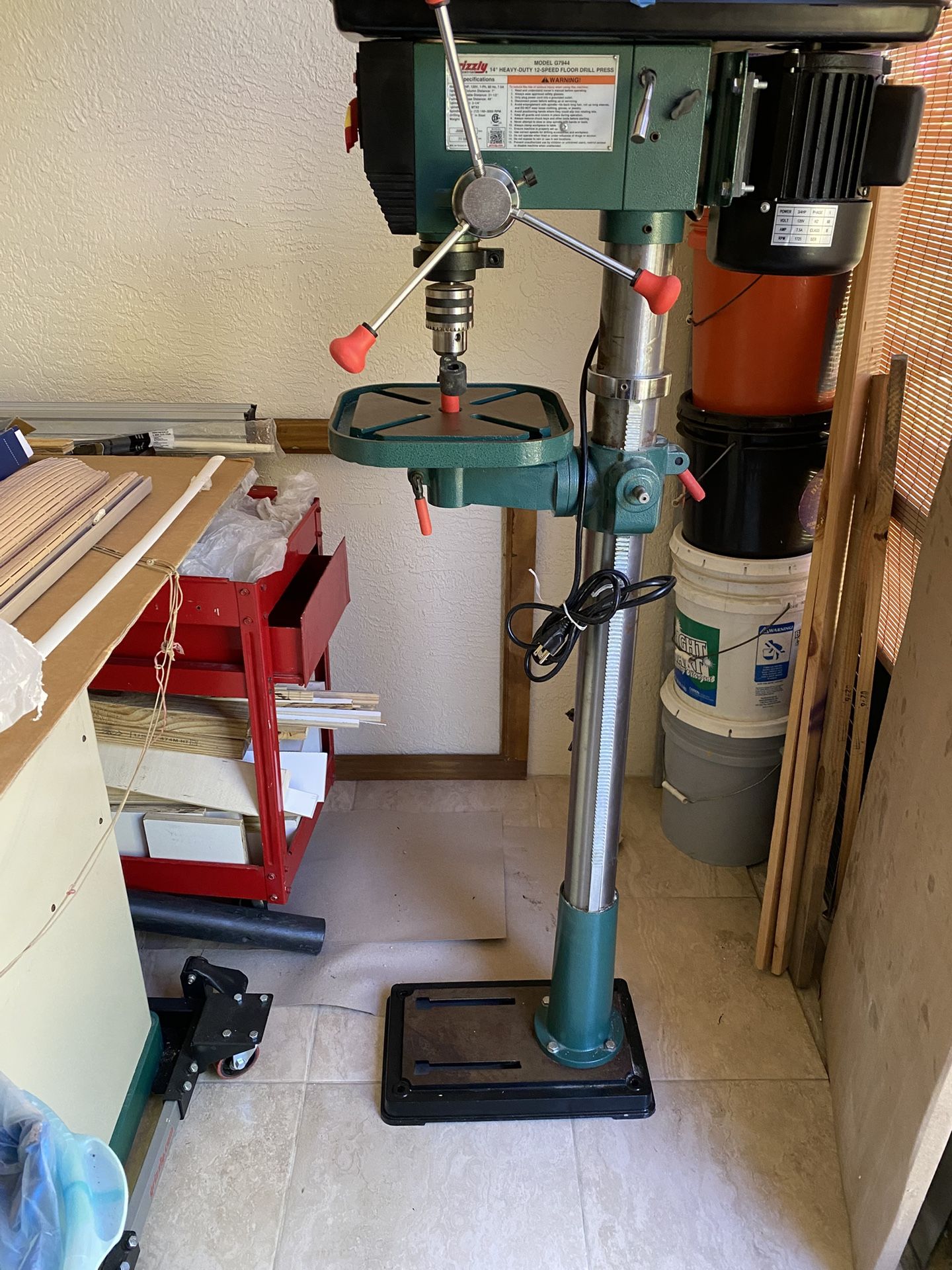Grizzly G7944 - 14" Heavy-Duty Floor Drill Press Selling my Grizzly 14" floor drill press, is in great condition. Motor: 3/4 HP Power Requirement: 120V, Single-Phase, 60 Hz Swing: 14 in. Type: Floor Range of Spindle Speeds: 140–3050 RPM Drilling Capacity: 3/4 in. Drill Chuck Type: JT33 Key Chuck Quill Diameter: 2.04 in. Shipping weight: 156 lbs.