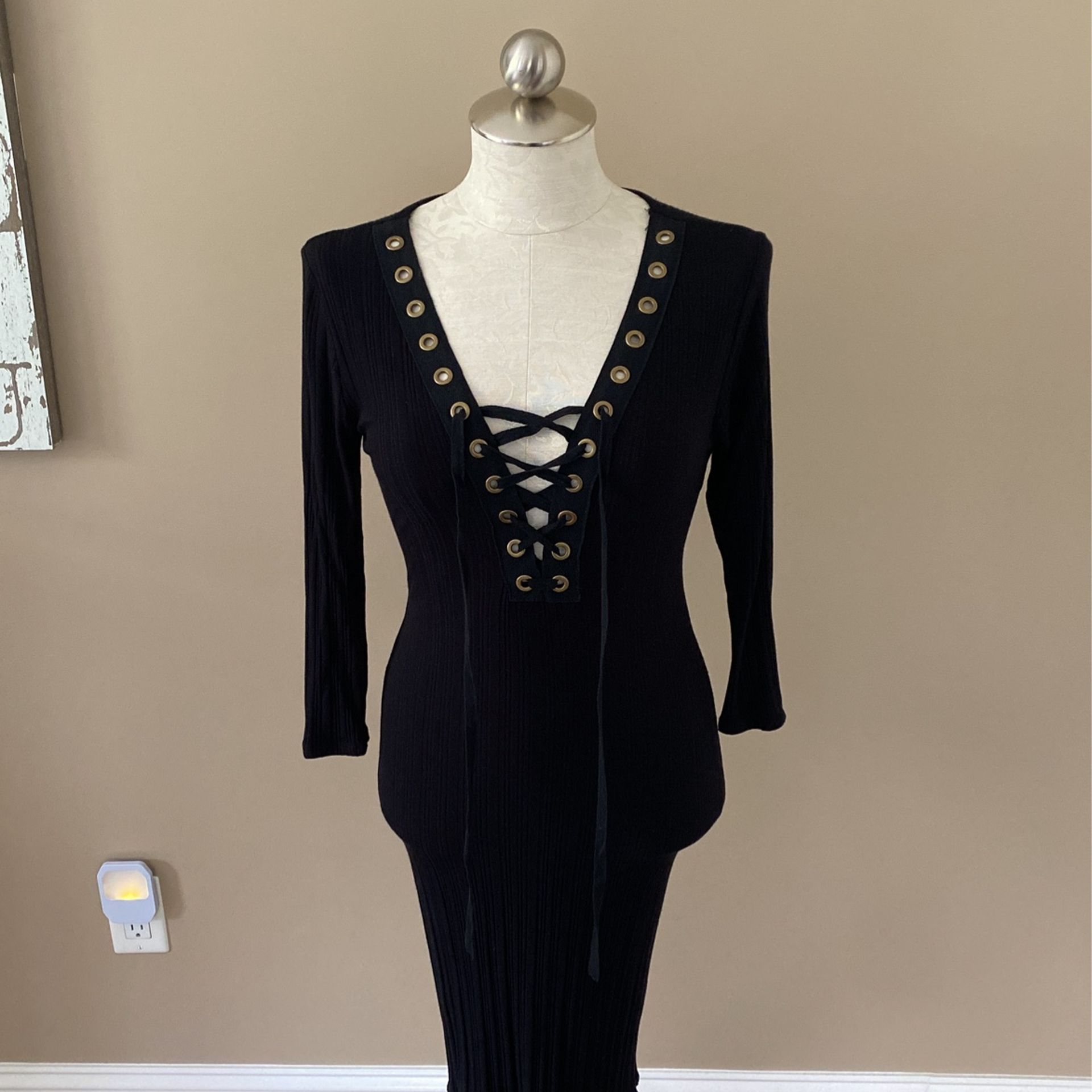 Black 3/4 sleeve, V-neck/tie, lined L-with stretch/fitted Worn twice