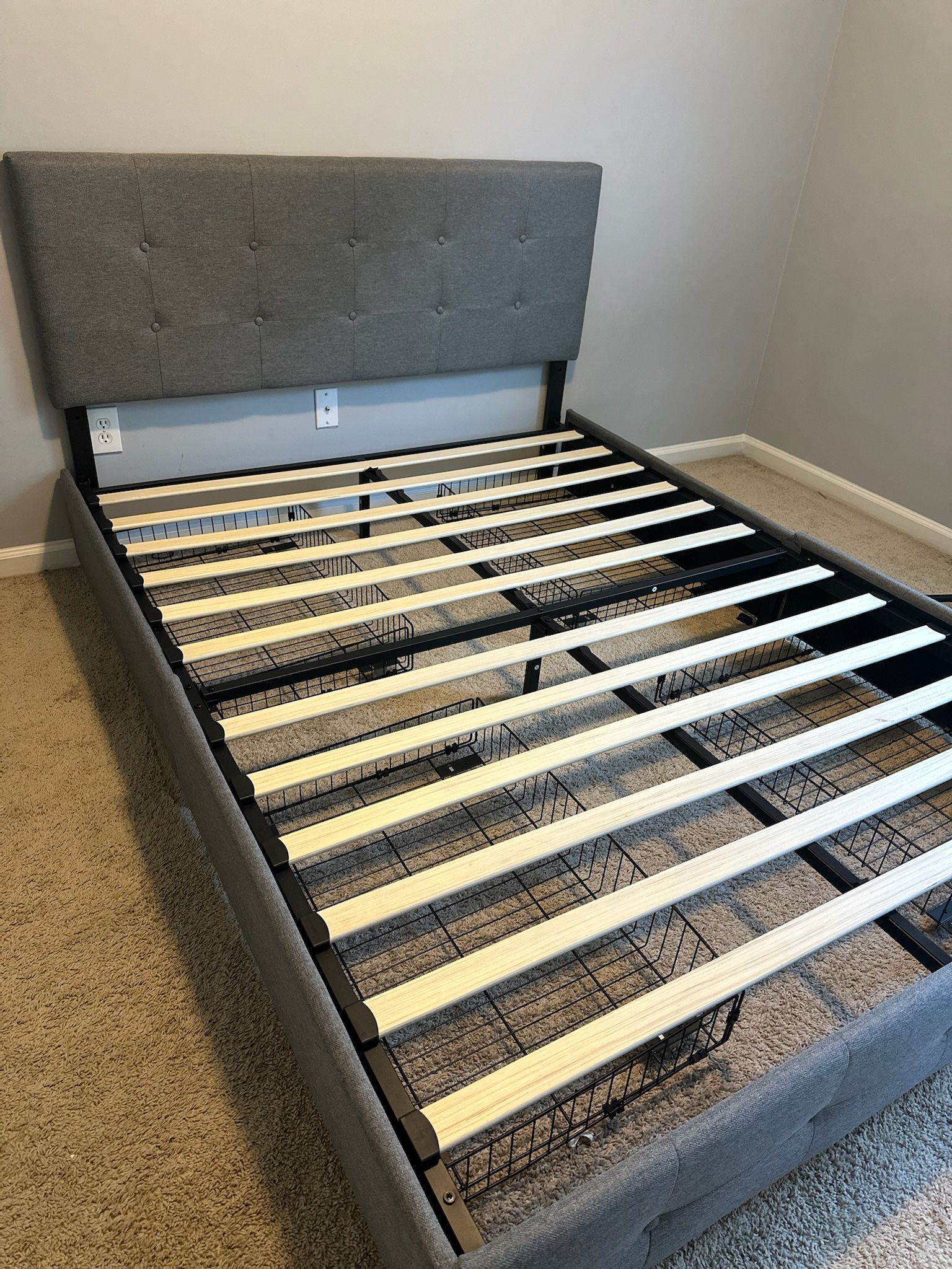 Modern grey bed frame with headboard, footboard, and wooden rails included. Comes with 4 built-in drawers for storage. Used less than 2 months like new! Moving and need it gone ASAP!