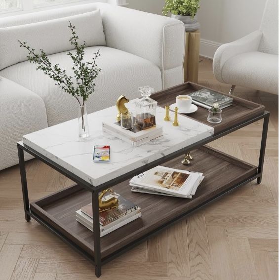 ODIKA Convertible Entertaining Coffee Table - Faux Marble With 2 Removable Trays, 47 Living Room Table, Modern With Storage Furniture, Walnut