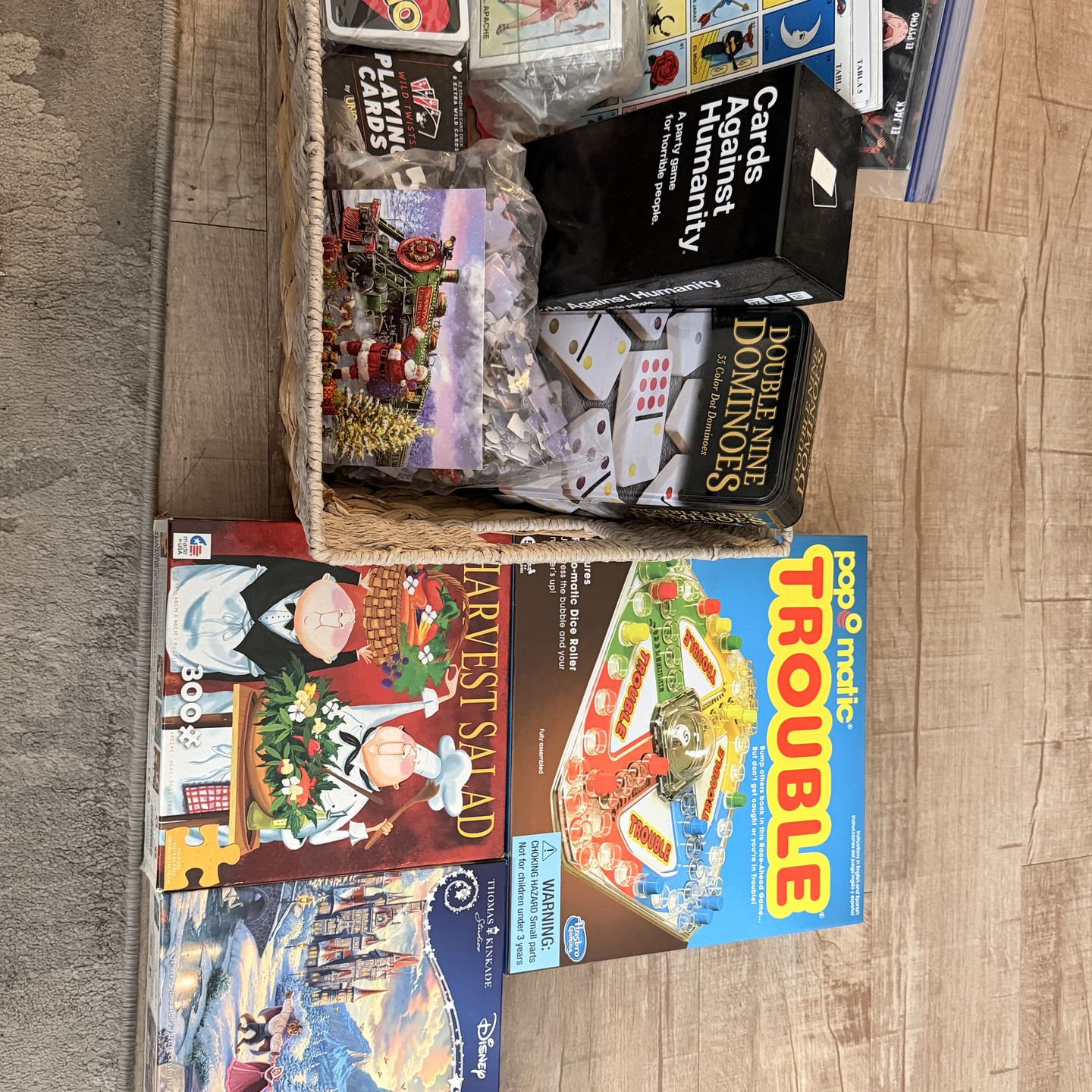 Selling a bundle of board games and card games. Everything included in photos. Includes: • Trouble game • Cards Against Humanity • UNO cards • Loteria set • Double Nine Dominoes • Playing cards • 2 puzzles (300 & 750 pieces) • Extra card sets • Storage basket included All in good used condition. Pickup or Drop off around Riverside & Jurupa Valley only. Need gone ASAP. Before March 30th