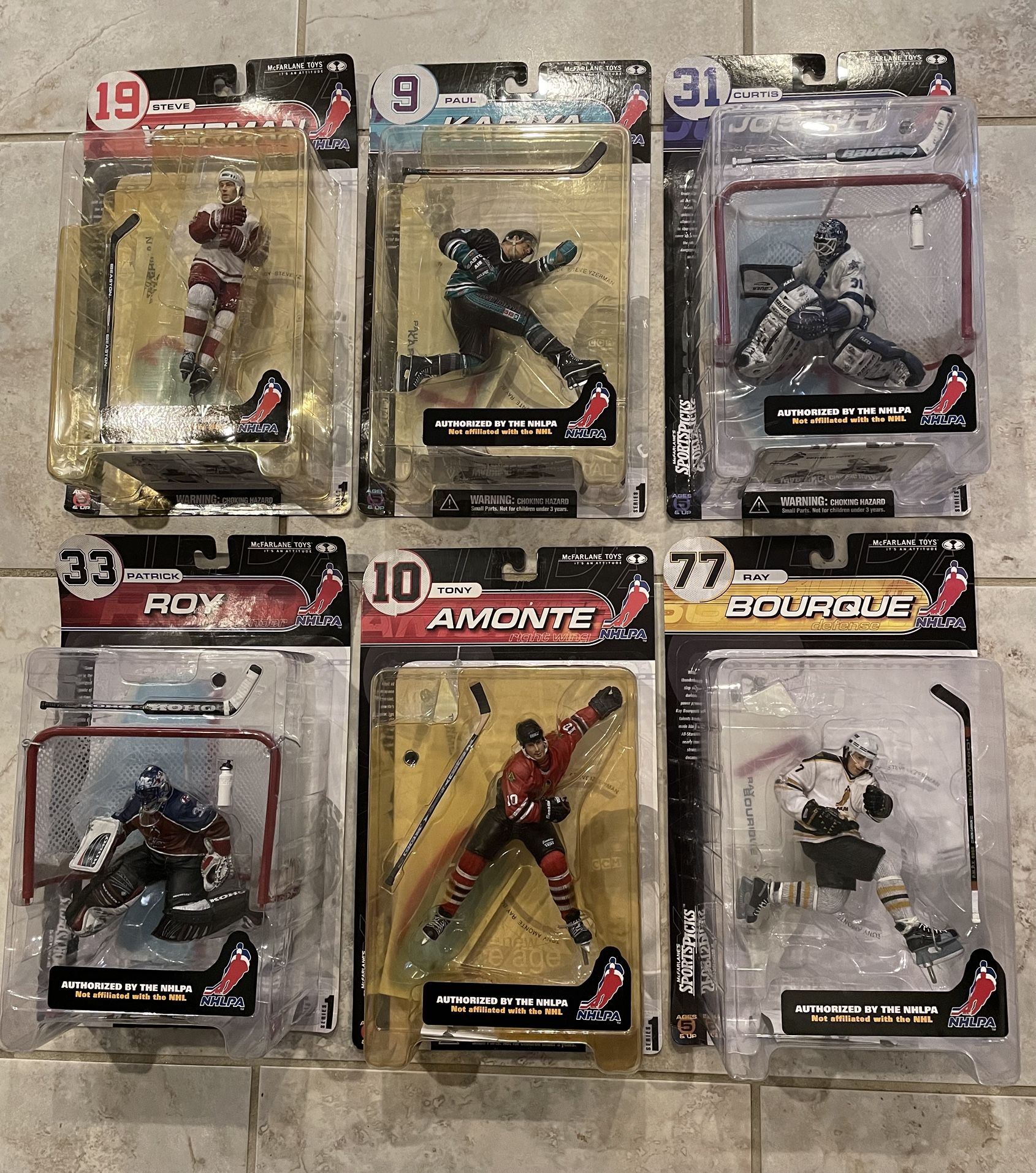 This is the complete Series 1 set of McFarlane hockey action figures in their original, factory sealed, unopened packaging. The set includes: Patrick Roy, Curtis Joseph, Paul Kariya, Tony Amonte, Ray Bourque, and Steve Yzerman. The players are in their team color uniforms however, the figures were issued prior to the NHL licensing agreement and therefore have the logo of the NHLPA on their jerseys. See pics for details. No delivery, you pick up, Losson/ Transit Rd area. I'm asking $120 cash for the entire set. If interested, message me and provide a phone number to contact you. If you are reading this, they are still available so don't bother asking. Thanks!