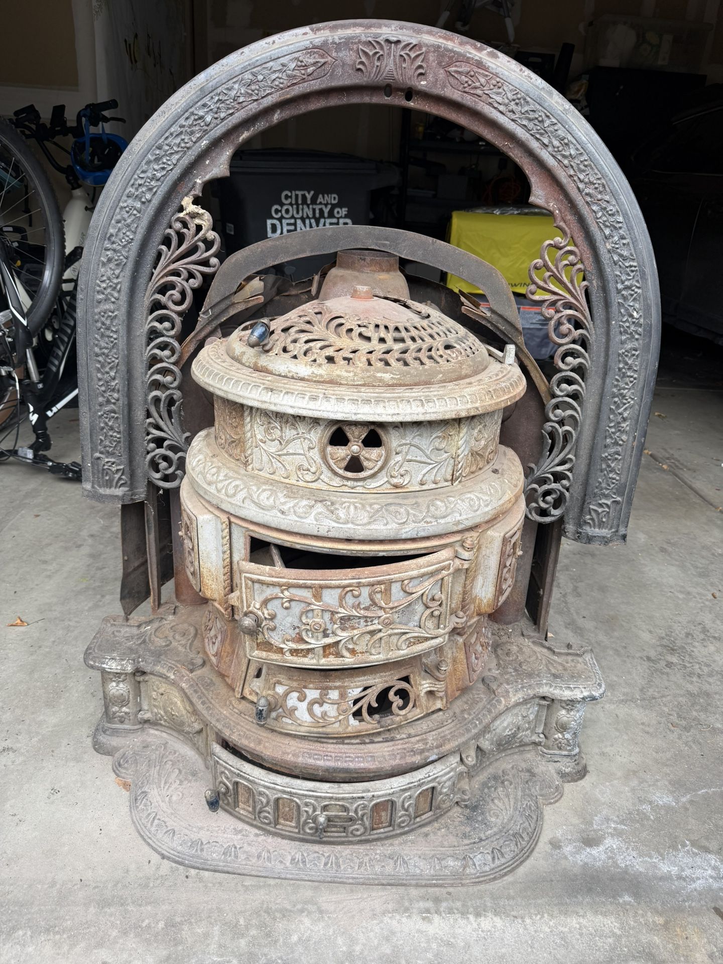 Antique cast iron parlor stove Late 1800s with makers mark and patent date from May 10 1887 Heavy ornate cast iron piece Great for restoration or display Stove stands about 38 inches tall and about 24 inches wide Very detailed scrollwork and all original castings Pickup location is near Havana and 1st Ave in Denver, can deliver for a additional cost