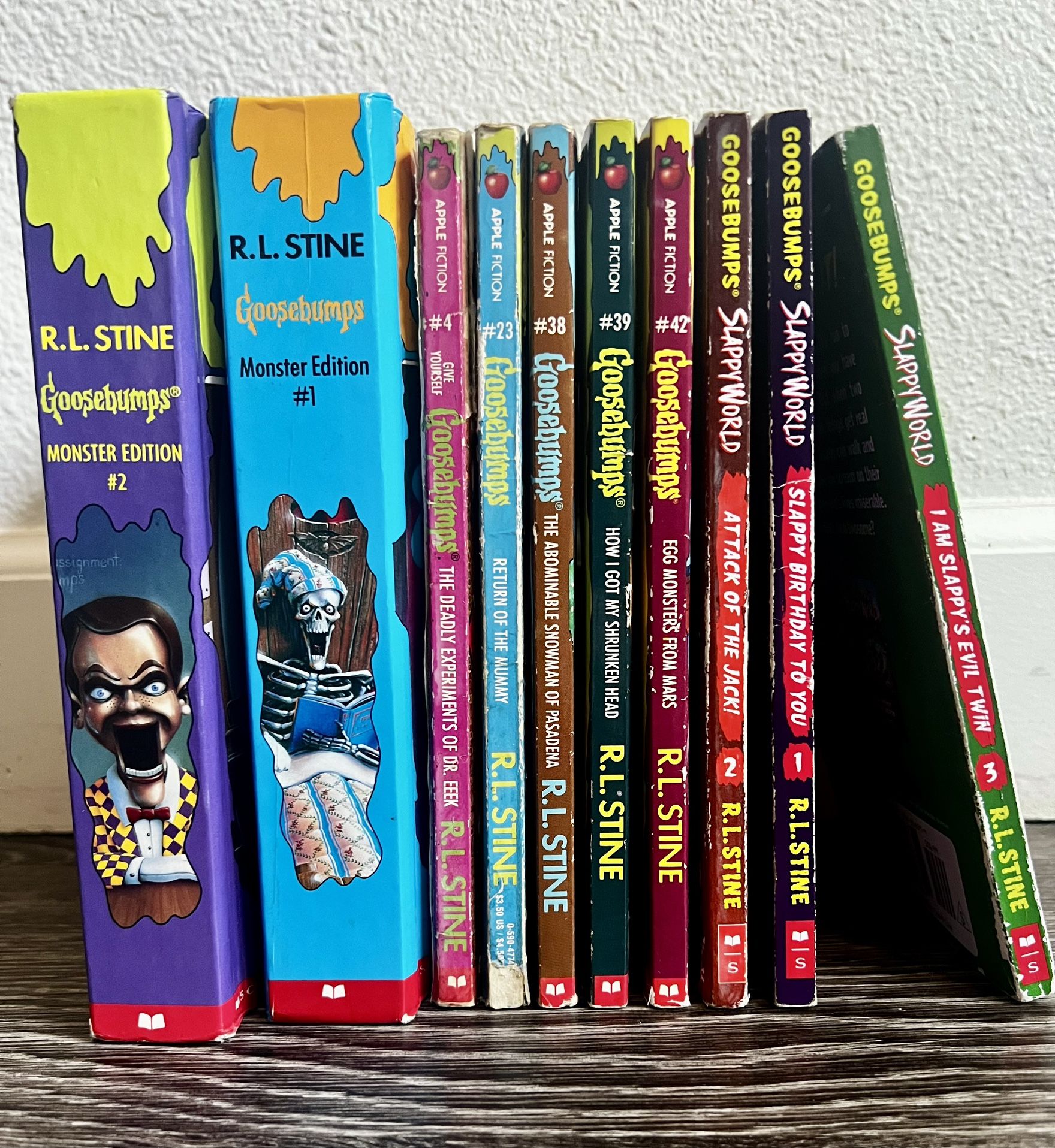 10 Goosebumps Books. 2 are larger hardcover Monster Edition Must take all for $25.