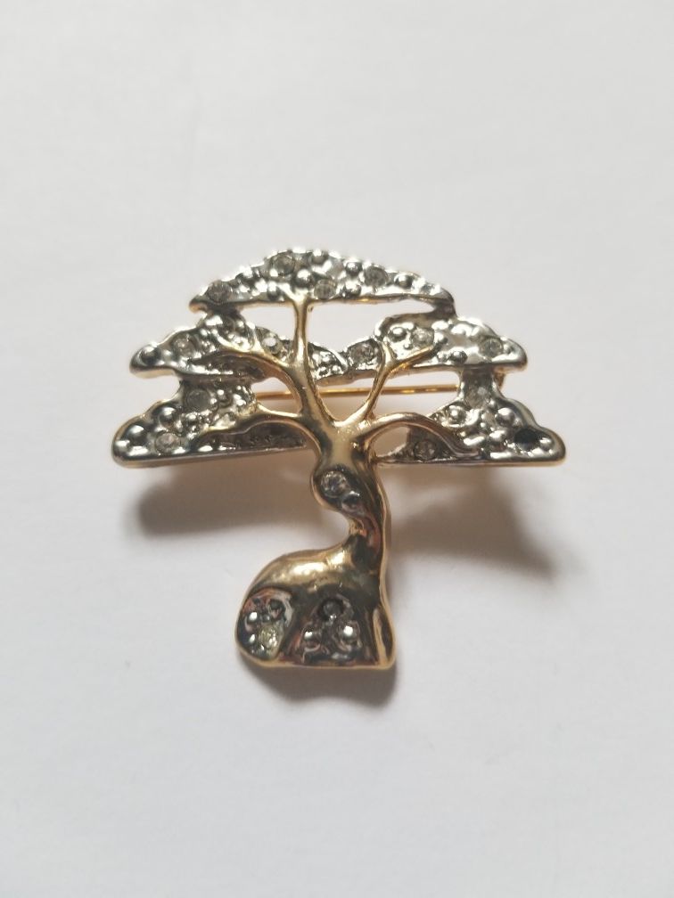 This is a baobab tree pin/brooch, native in Africa.This is the same tree in Disney's The Lion King. It reminds me greatly of a family tree. The brooch is gold on the trunk and branches. The leaves are silver and white rhinestones. This item is new with tags. I have included the measurements in the photos. I have multiples of this item available. Please feel free to make me an offer. EMOUBx3BBgA