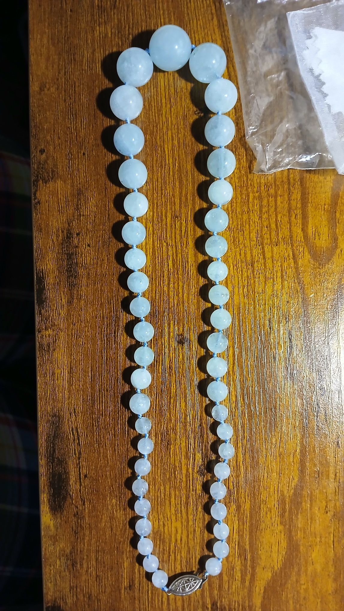 Elevate your collection with this exquisite hand-knotted graduated strand of genuine natural milky aquamarine beads. Featuring approximately 45 smooth round beads ranging from 7mm to 20mm (chunky largest beads at the center for a bold yet elegant statement), this necklace has a serene, ocean-inspired pale “sea foam” blue hue with the classic cloudy/milky translucency that makes milky aquamarine so unique and calming. • Total Length: 21 inches – perfect princess/matinee length for versatile wear • Color & Style: Soft milky pale blue with natural inclusions and subtle glassy highlights – a soothing, dreamy look prized in natural beryl gemstones (March birthstone!) • Craftsmanship: Professionally hand-knotted on light blue silk/thread between each bead (adds luxury drape, security, and prevents scratching) • Clasp: Beautiful silver-tone ornate filigree safety clasp (oval fishhook design with intricate detailing) – secure, decorative, and adds a vintage flair • Weight/Feel: Substantial chunky presence from the large center beads, yet lightweight and comfortable for everyday or layered styling This piece captures the tranquil essence of the sea – ideal for boho, minimalist, or spiritual jewelry lovers. Milky aquamarine varieties like this are naturally included for that hazy, luminous effect. Condition: Excellent – clean, no chips/cracks, ready to wear. Pre-owned but well-cared for. *** Message me for any questions , not firm on $173****