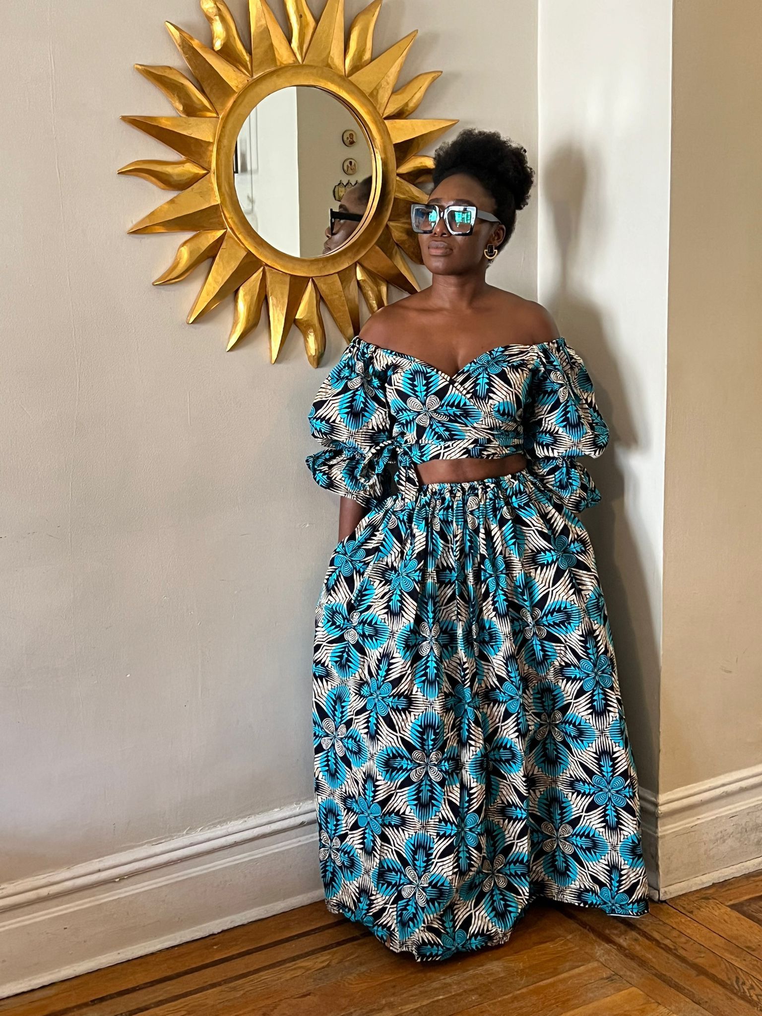 Authentic handmade African fashion two-piece summer dress. Blue Made in Africa by skilled artisans. Size 8-10 US 100% cotton
