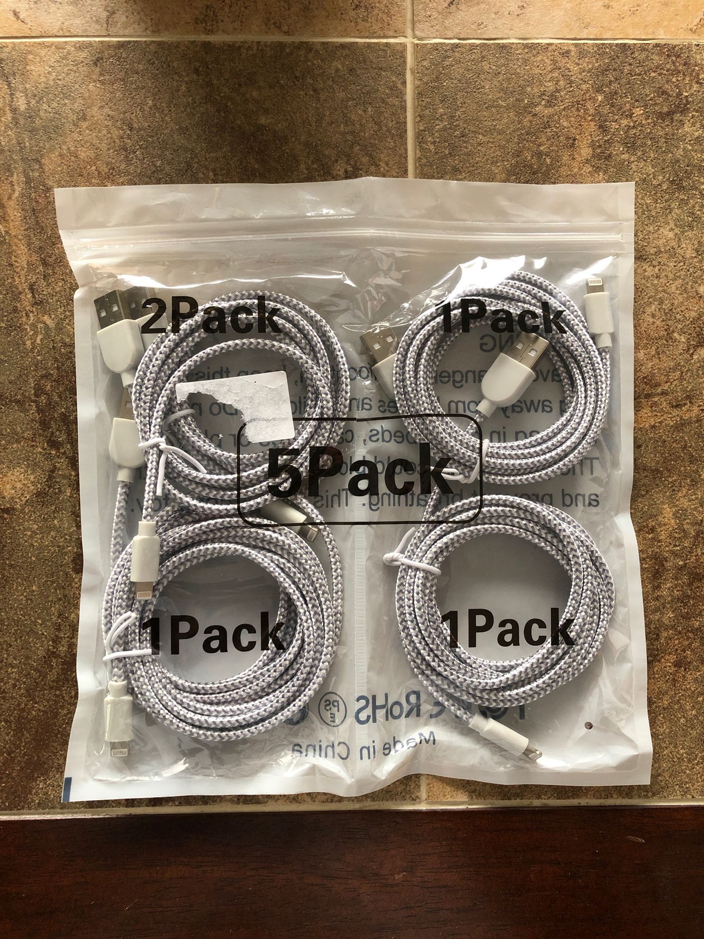 Brand new 5-pack iphone charging cables. Includes: 2x3ft, 2x6ft, 1x10ft cables.