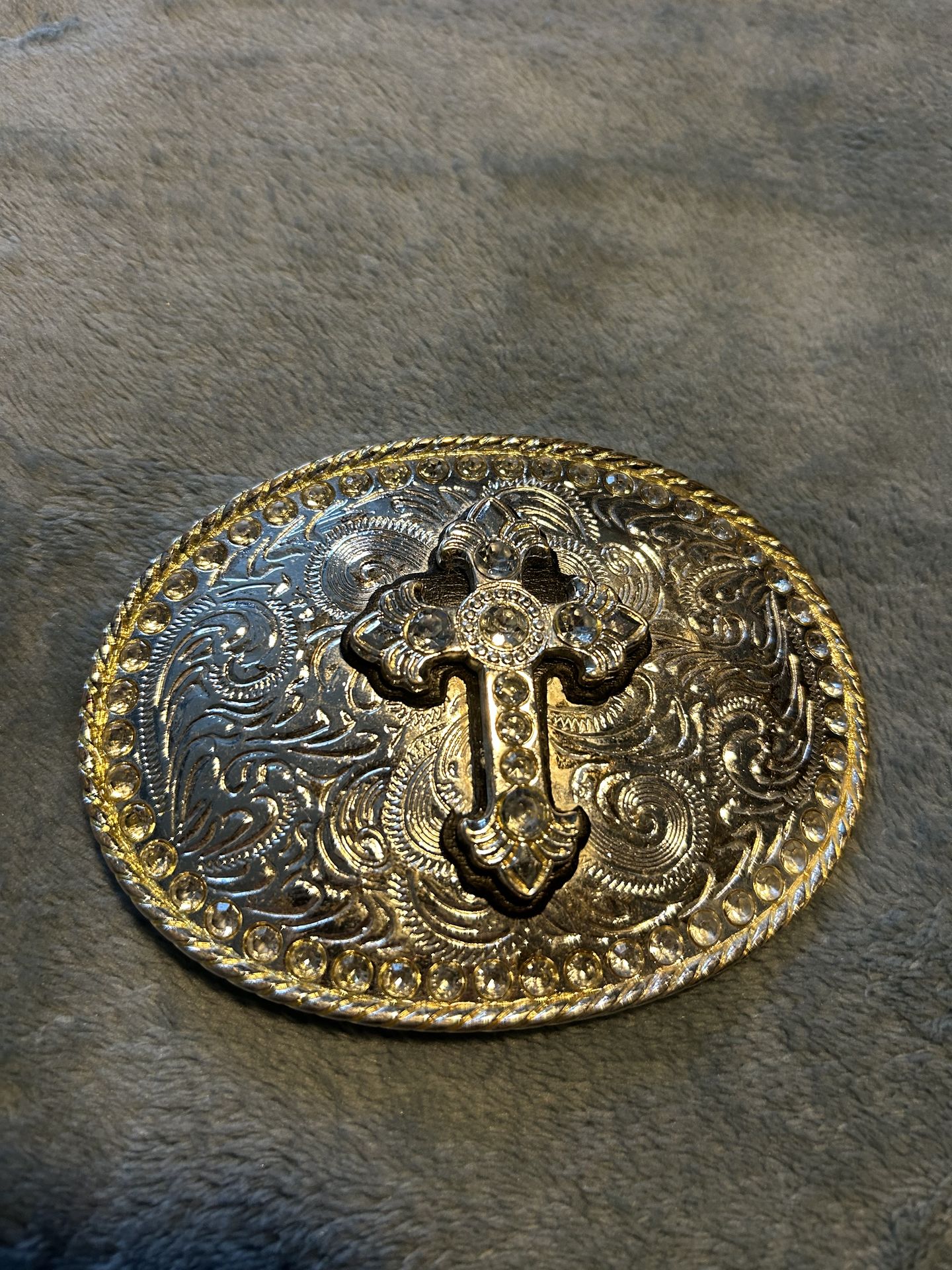 Silver Engraved Flower Filigree Rhinestone Filled Raised Cross Belt Buckle Great new 5”x4”