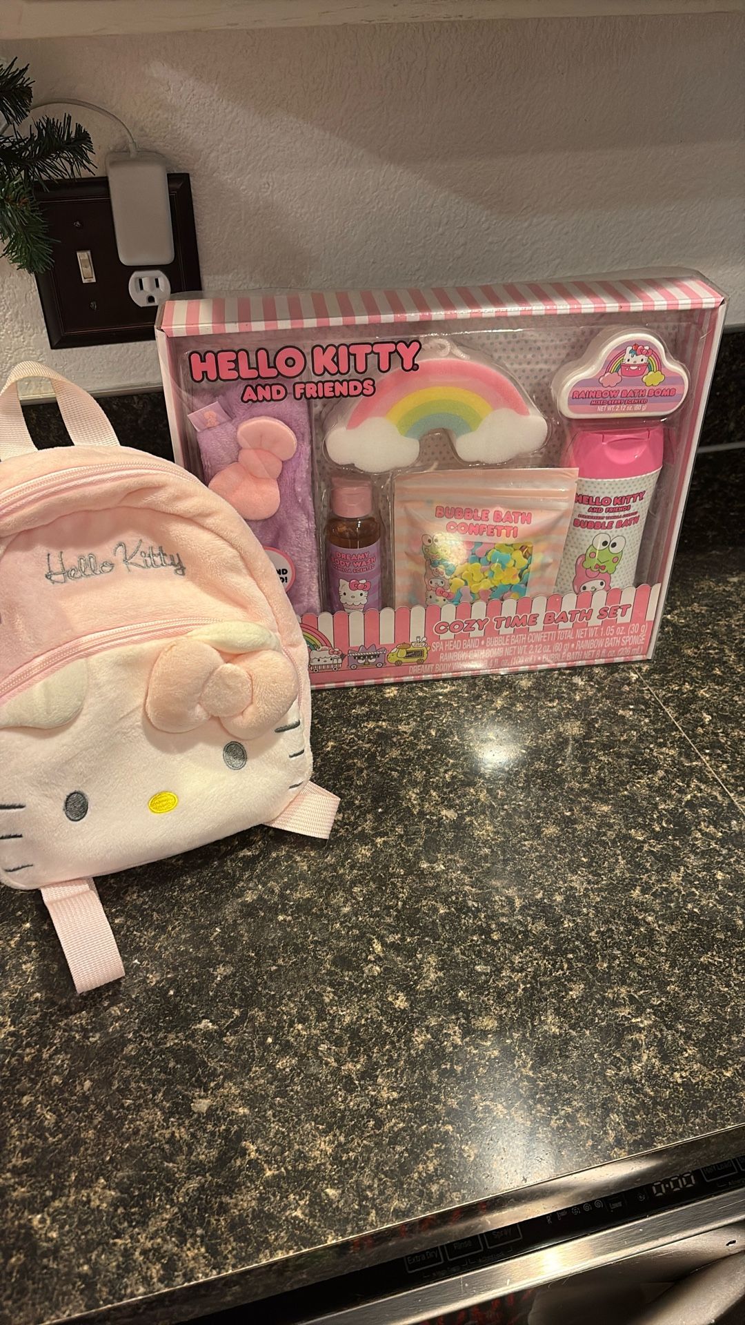 Cute used mini hello kitty backpack smoke free home Brand new in box hello kitty bath 6 piece set includes: spa head band, bubble bath confetti, rainbow sponge, rainbow bath bomb, body wash and bubble bath