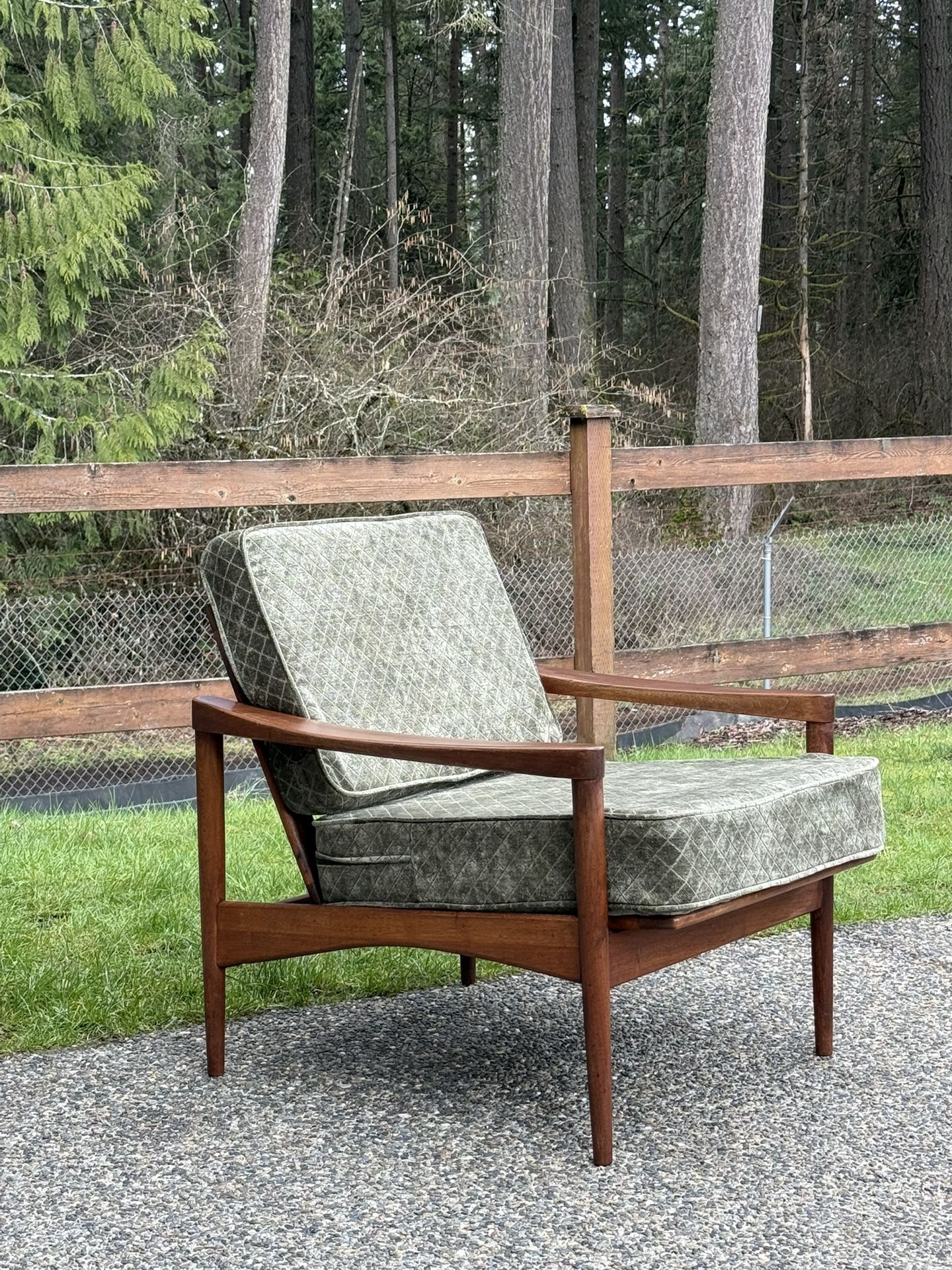 Mid Century Modern Danish Teak Easy Chair Circa 1970s Delivery available for a fee This is beautiful Danish lounge chair from the 70s. The chair come with new cushion, new webbing and Teak solid wood frame.The Chair is in very good condition. Ready for a new home.