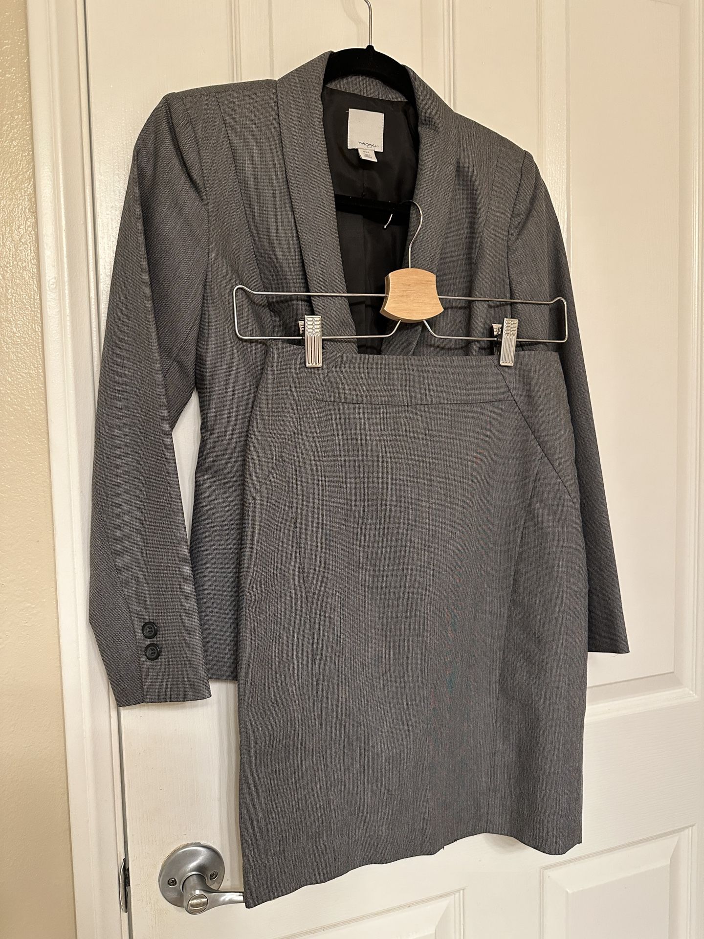 Halogen Grey Suit Set (Blazer and Pencil Skirt) Very cute and modern suit style, worn twice to job interviews. Excellent condition and dry cleaned. Purchase comes with the gray blazer (size 00P) and gray pencil skirt (size 00P). Dry clean only, per label
