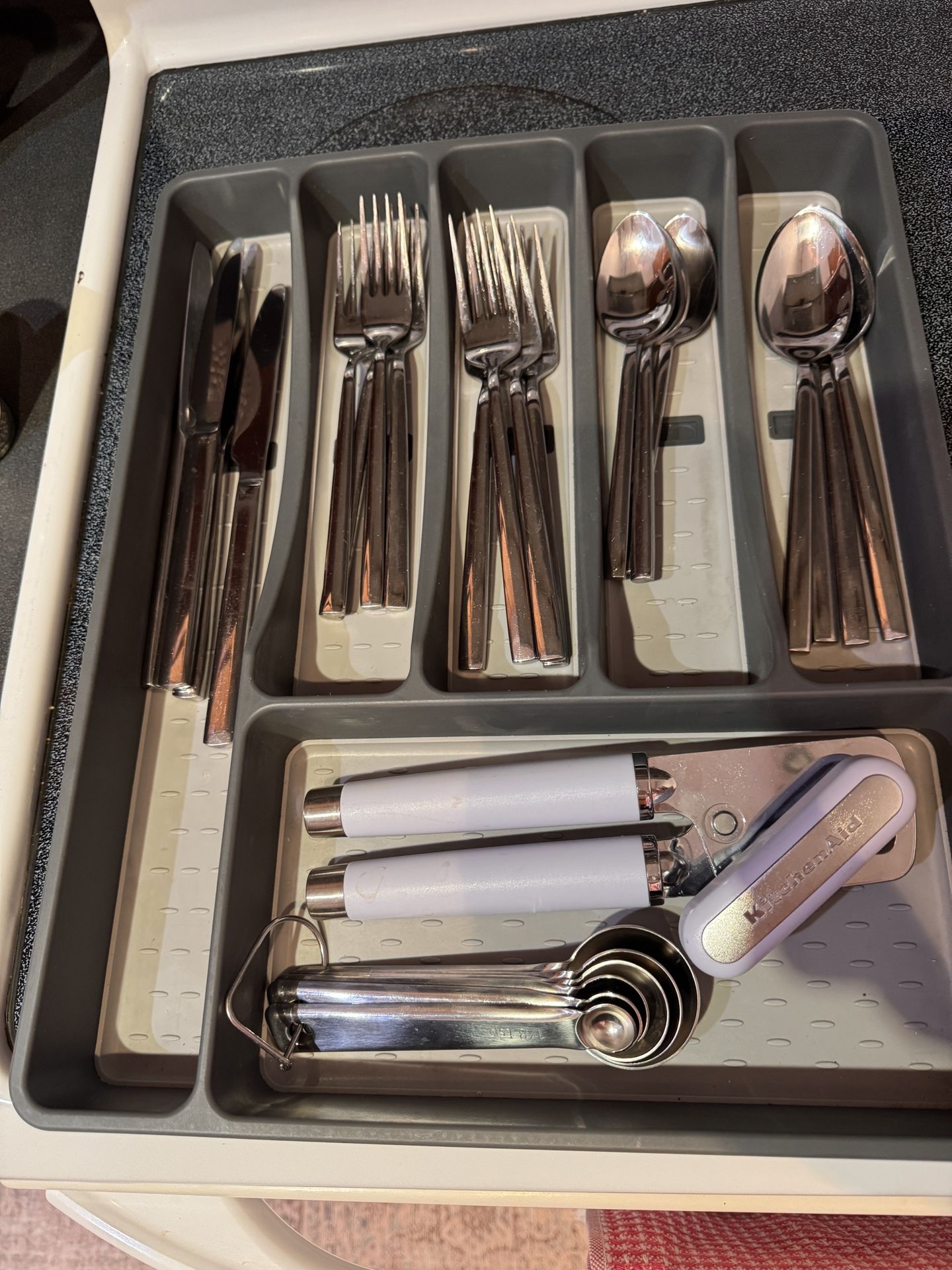 Stainless steel silverware set 🌟great quality not flimsy 🌟 full set includes measuring spoons and a kitchenaid can opener 🌟PLUS a roomy silverware tray for organization. It’s all in excellent condition great for kitchen starter or a silverware refresh. I’m moving and can’t take with. Pickup in Brickell