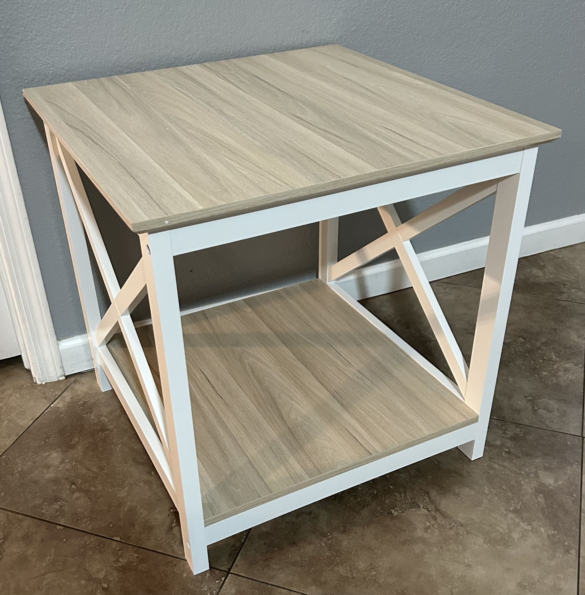 This is a brand new ChooChoo white side table with an oak colored top and 2 tiered shelving. Measures 24”D x 24”W x 24”H $60