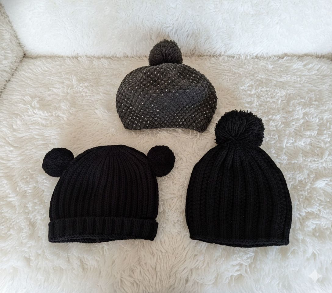 Stay warm with these adorable, brand-new winter hats! I have three different styles available. All are in perfect, unworn condition. Price: $5 per hat (or take all 3 for $12!) The Styles: • The Sparkly Beret: A stylish charcoal grey knit beret featuring subtle shimmer/sequin accents. Perfect for a classy winter look. • The Bear Ear Beanie: A classic black ribbed knit hat with two cute pom-pom "ears" on top. Great for kids or a fun, playful style. • The Classic Pom Beanie: A thick, black ribbed knit beanie with a large matching pom-pom. A timeless winter essential that goes with everything. Condition: Brand New (Never worn) Size: One size fits most (stretchy knit)