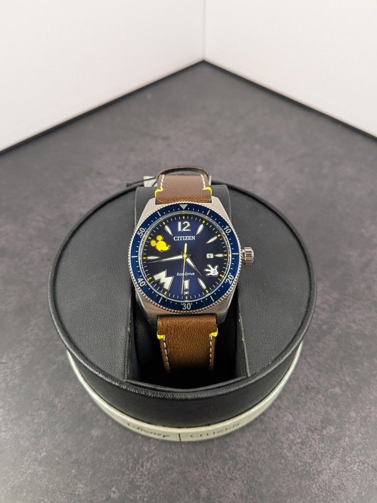 Citizen Mickey Mouse Chronograph, comes with the original box. Watch in mint condition BEST OFFER GETS IT 100% Customer Satisfaction Guaranteed ALL SALES FINAL. What you see is what you get ****SPECIFICATION**** Band Length- 254mm Case Width- 43mm Lug Width- 22mm Band type- Leather Case Material- Silver-Tone Stainless Steel, Aluminum bezel, Ion Plated Bezel Crystal- Mineral Crystal Impact and shatter resistant Clasp- Buckle Dial- Blue Water-Resistance- WR100/10Bar/333ft