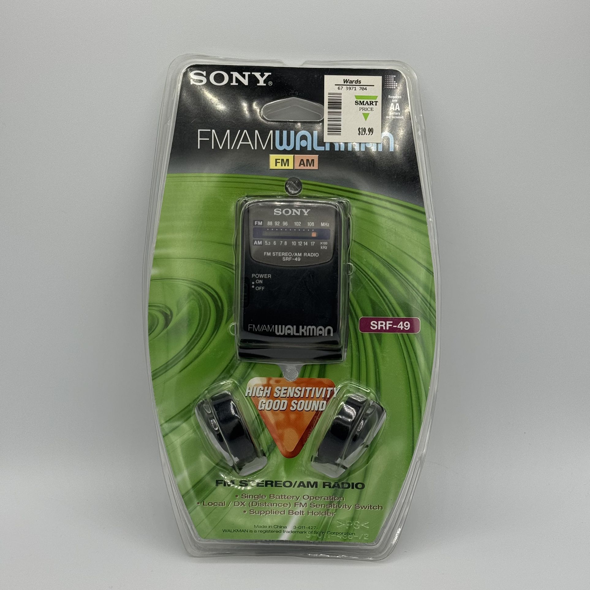 New Sony Walkman FM/AM radio. Still in original package, comes with headphones. Model SRF-49. Takes one AA battery. Good sound and high sensitivity. Belt holder included.