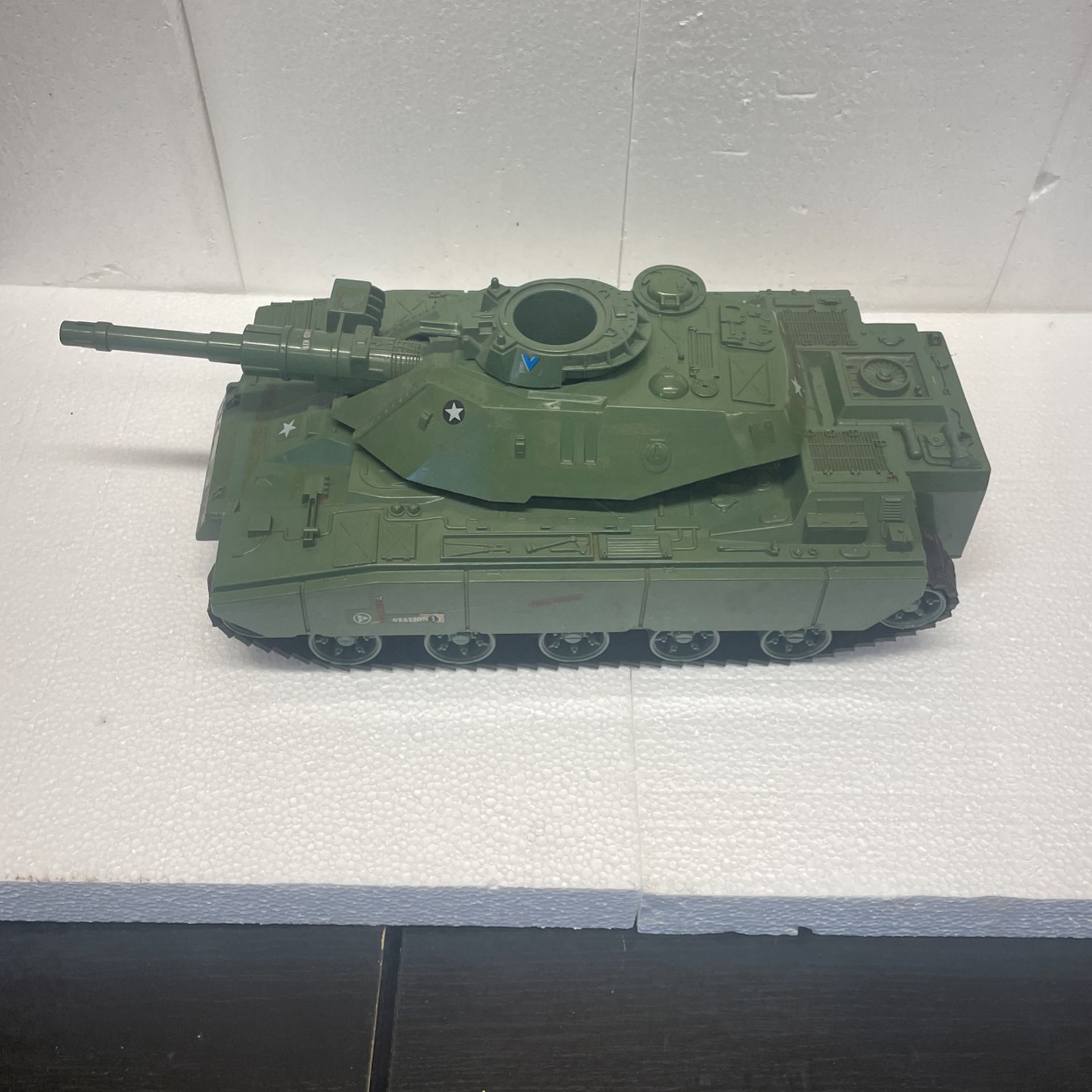 Motorized tank moves forward back, left and right. Works with two D batteries. Missing center gun