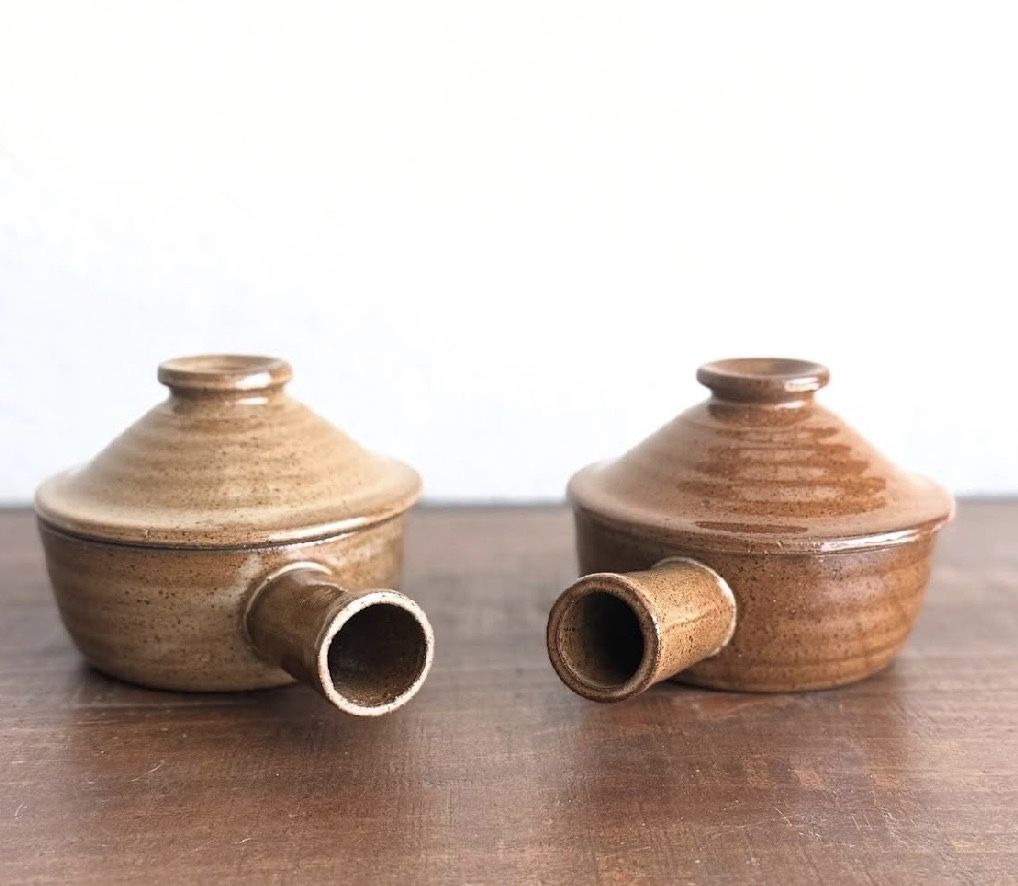 A charming pair of speckled earthenware soup bowls with cozy lids and hollow handles, perfect for savoring warm, comforting meals. Their earthy glaze and handmade feel bring a touch of rustic warmth to any table. Ideal for soups, stews, or simply adding character to your kitchen display. The measurements of these items are 6.5"x5"x4", and they weigh 2lb 10oz. If you’re interested please send me a message, serious inquiries only. ITEM #357