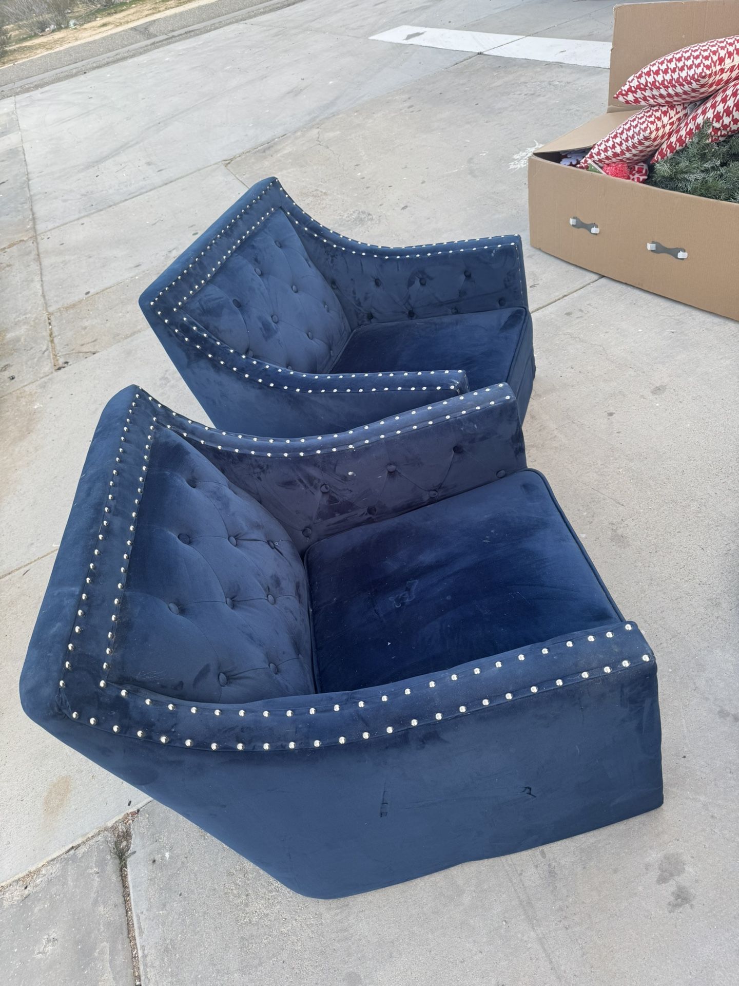 Pair of royale blue suede chairs just need a slight cleaning since they were in storage, were in a non smoking no pet home for less than a year