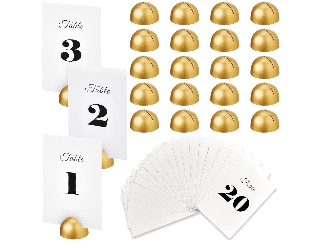 Package Content: what you will receive are 20 pieces of table number stands from 1 to 20 and 20 pieces of table number cards, enough quantity to arrange your guests' seats and satisfy your replacement needs in daily life Reliable Material: these number cards are made of thick cardstocks with vivid and clear printings, which are not easy to break or fade; These table stands for numbers adopt quality wood material, which are lightweight and sturdy enough to sever your long term use Elegant Design: these table numbers for wedding reception are designed with black artistic words on the white background, which are consistent with the modern and simple style of modern people; The card holder for table numbers is designed in golden semicircles, which look elegant and delicate, adding a romantic atmosphere Convenience for Guests: these table numbers for wedding reception and card holder for table numbers are clear to assign your event tables and to ensure your guests know exactly where to sit; In addition, their cute and extensive appearances can make your table more attractive Wide Range of Applications: these table number cards holder and table card numbers are suitable for wedding, birthday party, anniversary, engagement party, celebration, holiday gathering, restaurants and so on to ensure guests know where their seats are and make your event more charming