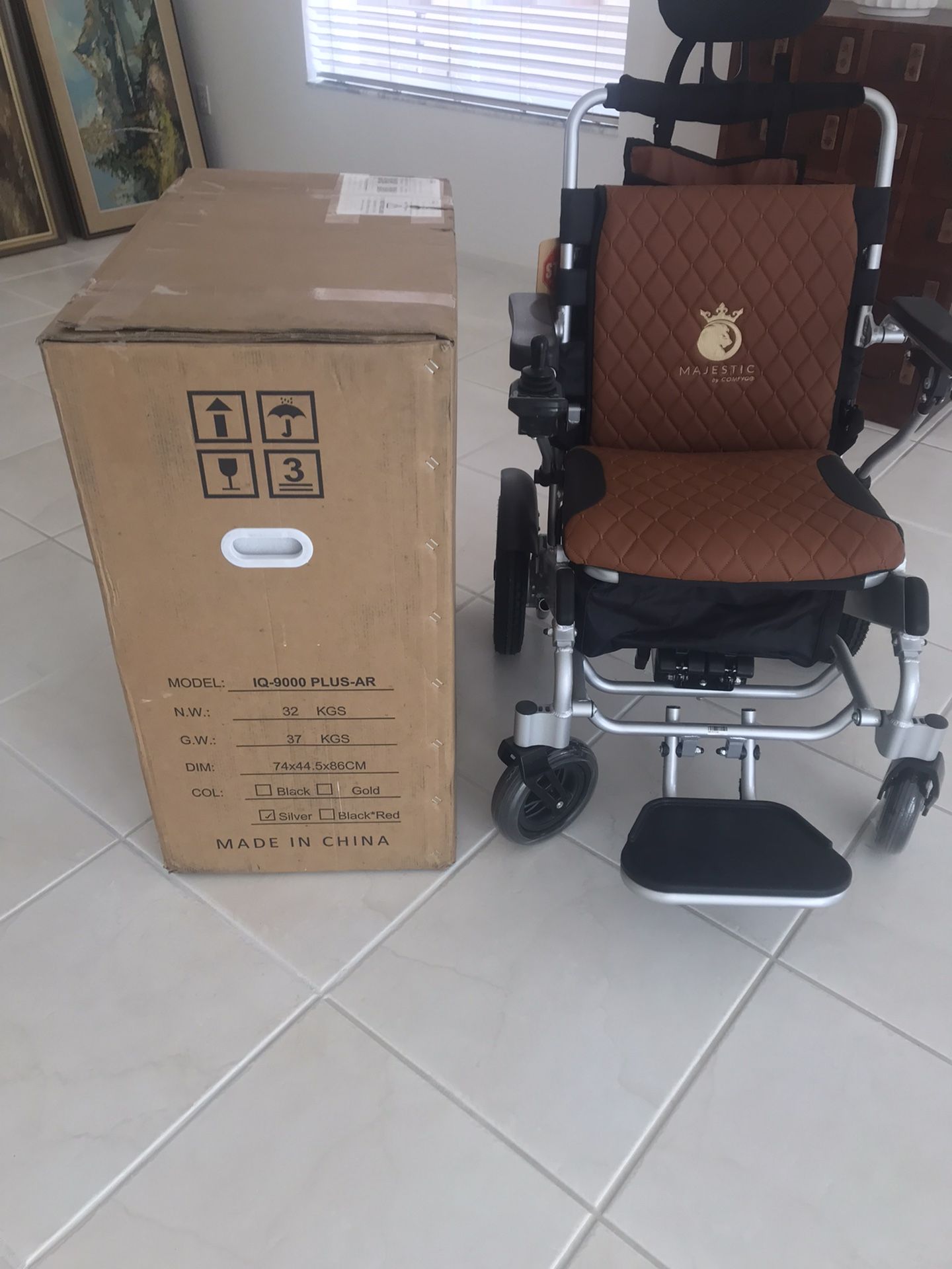 Electric wheelchair can also be operated With handheld remote. Majestic IQ 9000 is Brand new never used still has cellophane on tires. Still have original box. Easy to operate.
