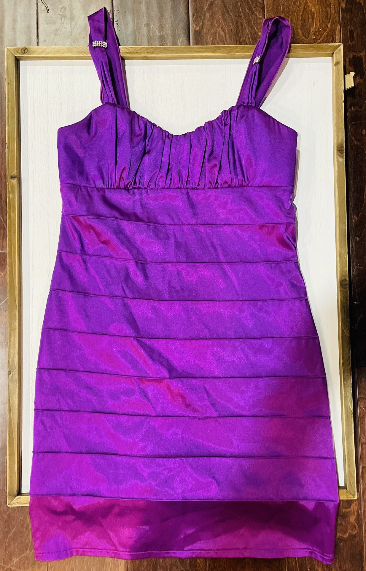 Trixxi Clothing Company Women’s Size 6 Purple No Sleeve Dress; Body: 97% Polyester & 3% Spandex and Lining: 100% Polyester; 28” in Height; Purple Shiny and Sheer Body with Textured Horizontal Lines; Rounded U-Neck/Chest and Back Zipper Closure; Silver, Jeweled (21 Small Stones) Clips/Clasps on Each Shoulder Strap; Lightweight; Short Length, and Form Fitting; RN# 106289; Made in U.S.A.; Hand Wash Cold & Line Dry or Cool Iron, if Necessary; Slightly Worn and in Great Condition
