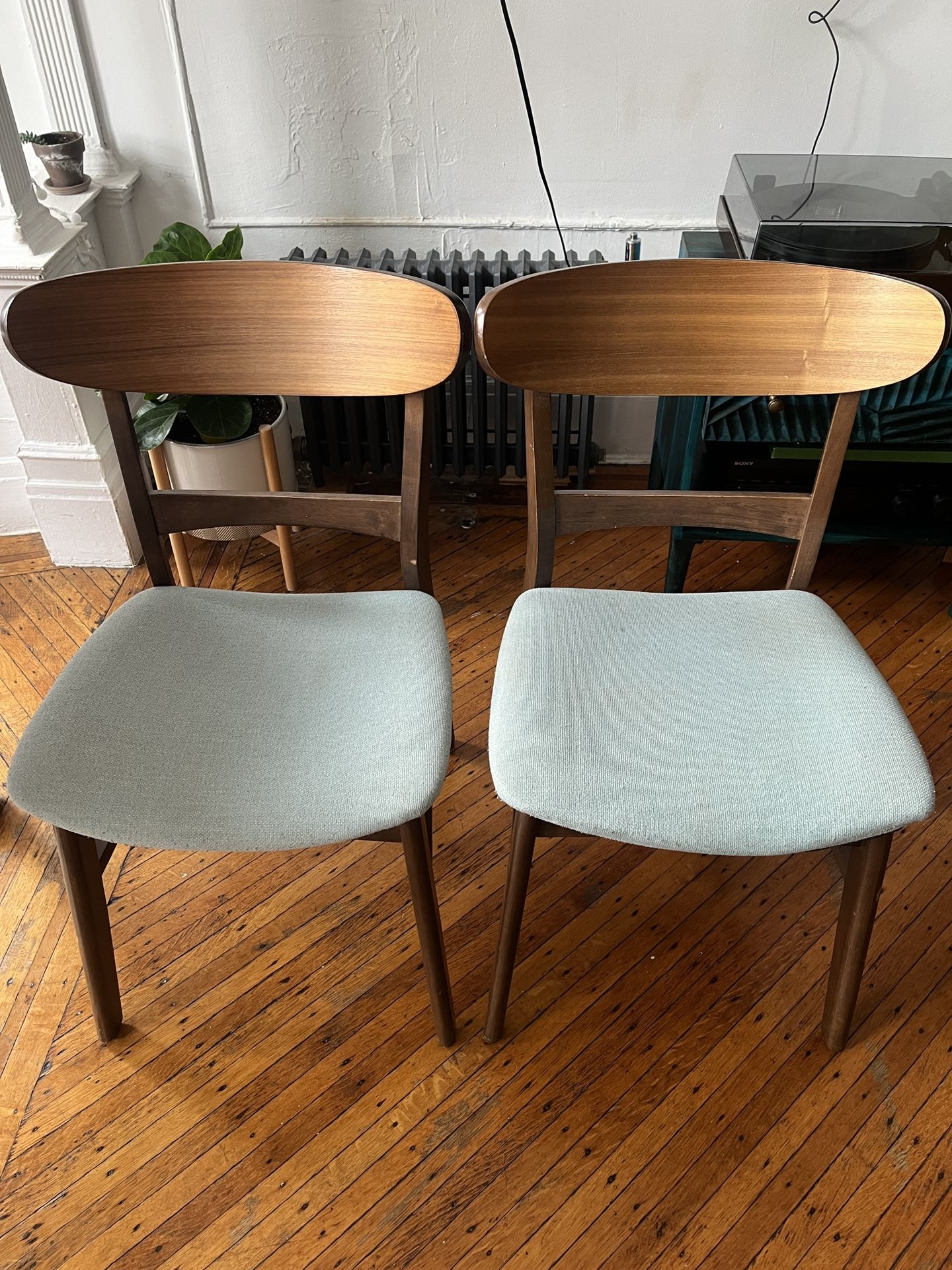 Two Wayfair Wooden MCM chairs, light sea blue seat.