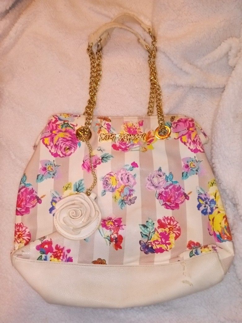 Betsy Johnson floral purse with golden chain shoulder straps. This is a beautiful purse, easy to stay on your shoulders. Has a white leather flower accessory on a golden chain as well. Asking $30 OBO. I'm located on 126th avenue just north of Thunderbird and available anytime for pickup. Please let me know when you would like to meet up to pick up this beautiful purse!