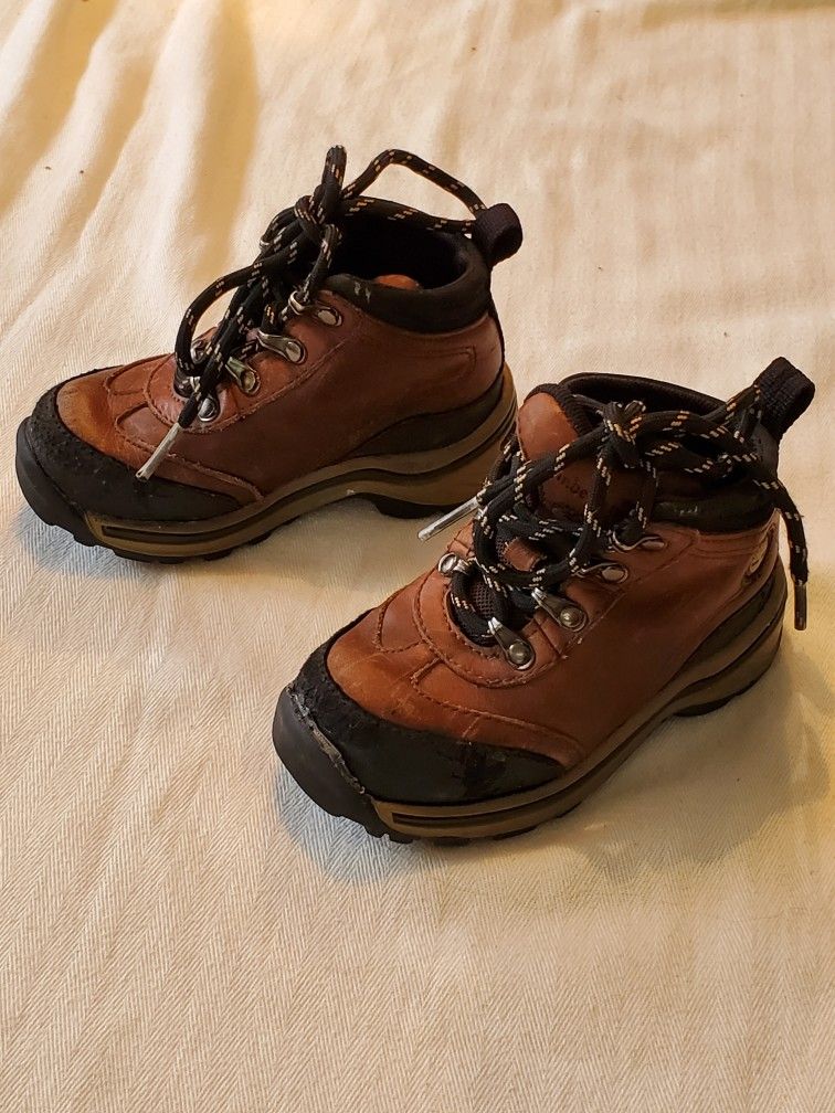 These Timberland hiking boots are the the same great quality as the grown up version. They're waterproof and have good arch support. They have some wear but are in generally good shape.