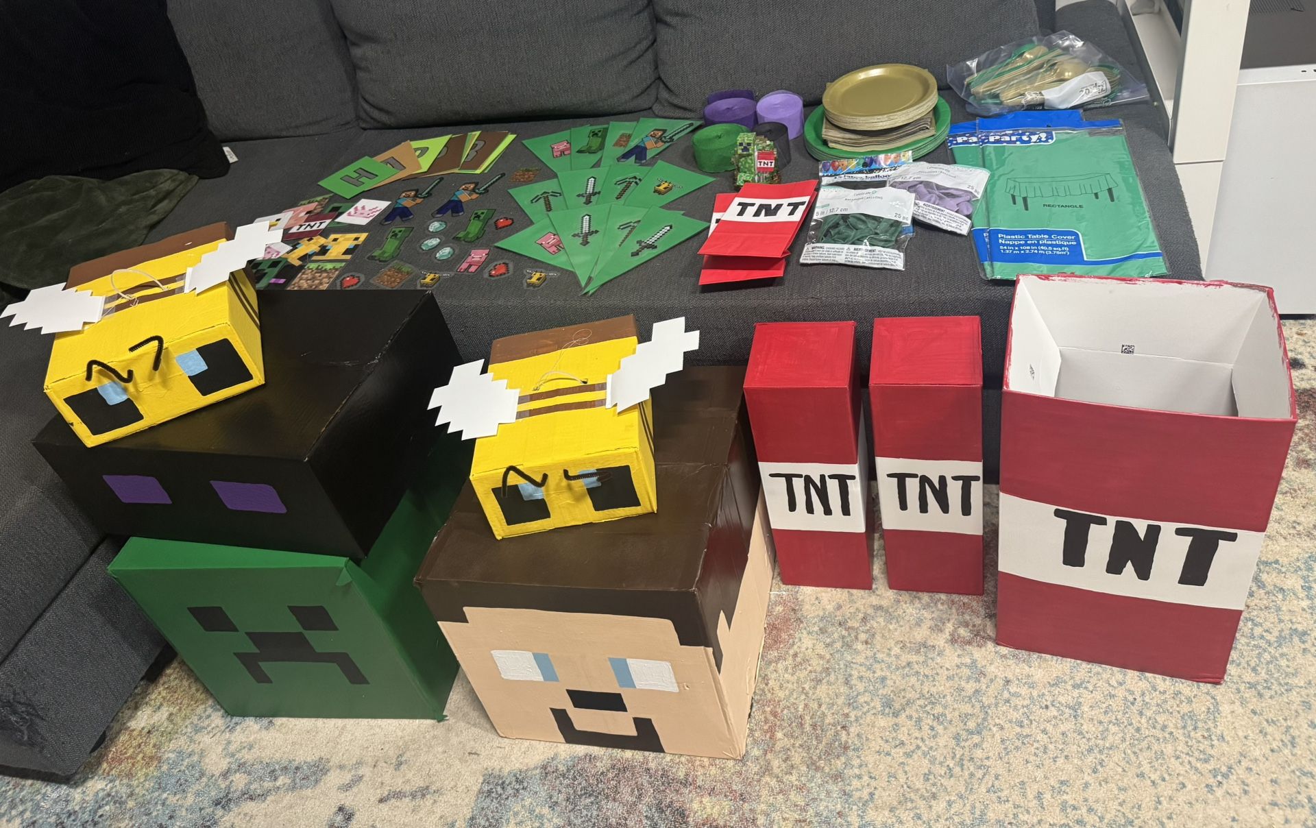 Selling a group of Minecraft party supplies. All the items to host a Minecraft party. - birthday banner - homemade hanging bees (2) - homemade steve - homemade creeper - home made enderman - home made TNT (3) big one is open to put Minecraft tools inside - over 30 big green plates - over 30 small gold cake plates - over 30 gold napkins - over 30 sets of cutlery - have painted Minecraft figure - 3 packs of balloons ( purple, green and black) only two of purple and green. - two brand new green table clothes - lots of laminated stickers that can be used multiple times. - 4 streams - lots of homemade/ laminated squares, we hung from ceiling. - lots of homemade/ laminated triangle banners