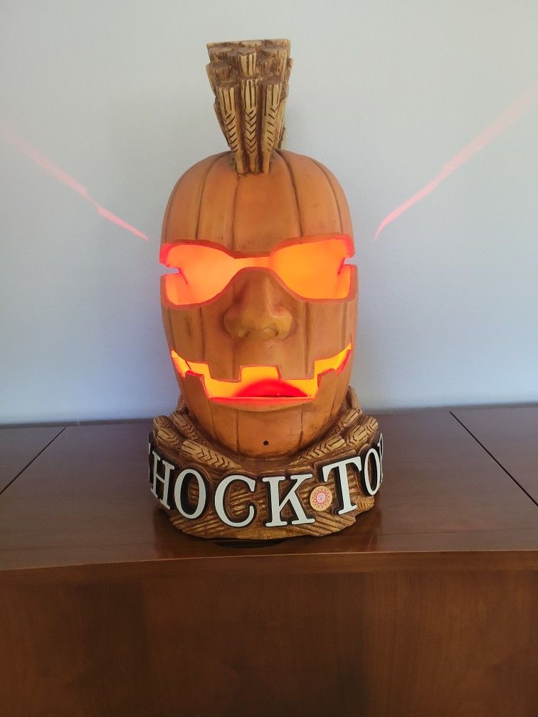 Vintage Shocktop pumpkin head bar display. It's extremely rare, and everything works great. It has a sensor on the front when activated it lights up and makes a spooky sound. It requires 3 D batteries to operate it. There is a switch on the bottom to turn on/off sound. If you want the lights off too just pull one of the batteries out. It has no scratches, dings, or knicks 100% in great condition! This is great for anyone who celebrates Halloween and enjoys a good time with friends and family. I have kept this out year-round on the corner of my bar. Considering it is a pumpkin head does not mean it is for Halloween only, it just means the beer is so good I can't wait for fall to have some more! Now I have moved and do not have the space needed to keep my buddy with me anymore, so I hope this goes to a great house with love! It measures 17 x 23