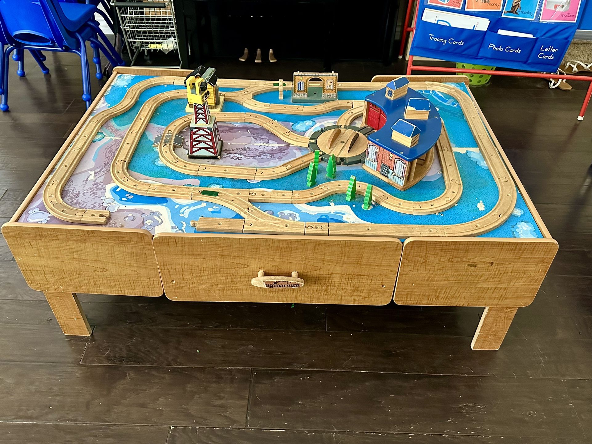 Imaginarium train table with tracks, trains and extra tracks included. Tracks are screwed down on to the table, but can be pulled out if you want to. Missing one drawer. Well loved with lots of life left in it still. Measures 49in x 33in x 17in. Will need big SUV or truck to transport. Pickup in Carlsbad 92009.