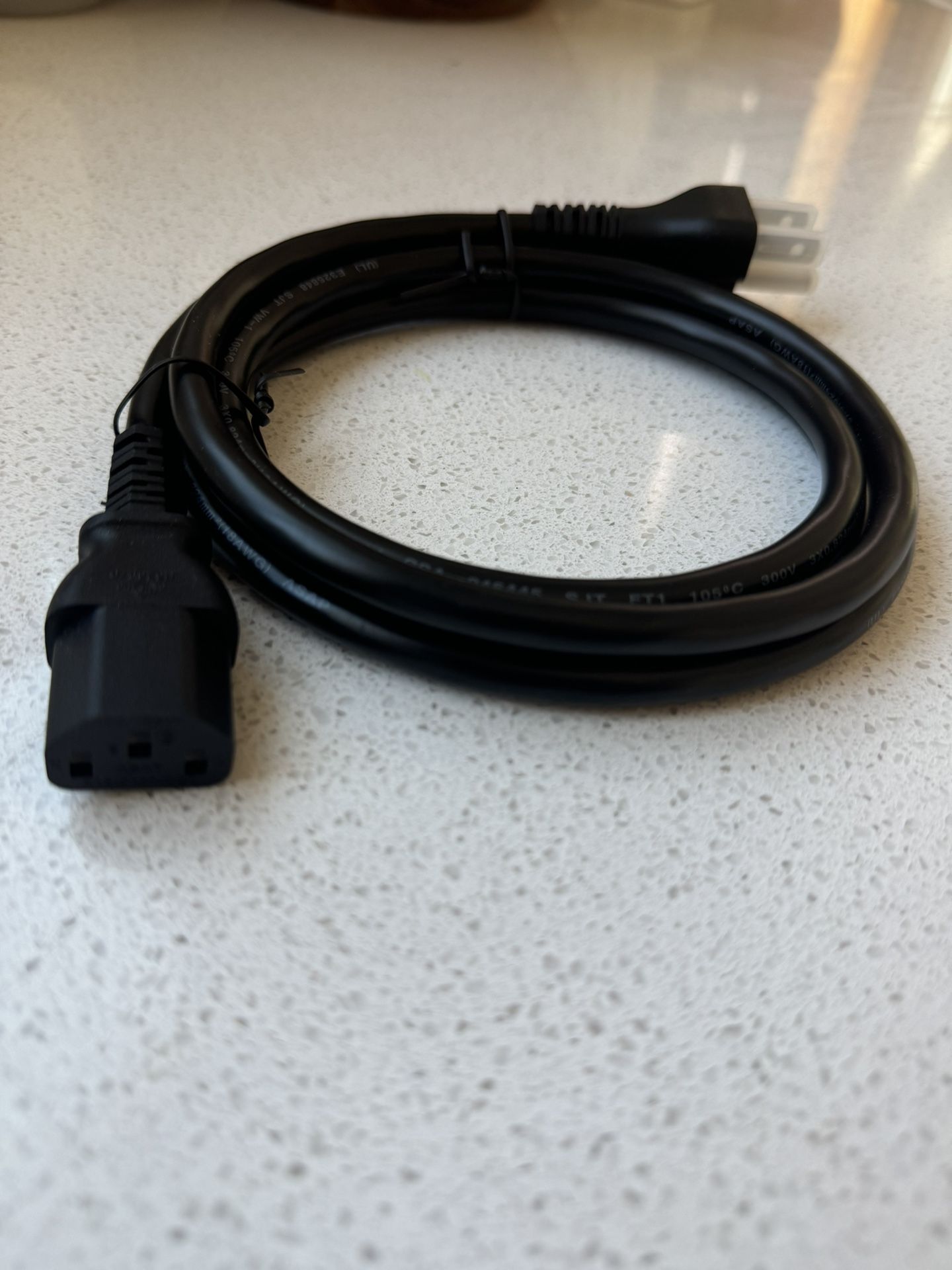 New, never used. Universal 6-foot replacement power cord COMPATIBILITY: 18 AWG (American wire gauge); NEMA 5-15P to IEC320C13 VERSATILE: Works with most PCs, monitors, printers, and more EASY TO USE: 3-pin power connector SAFETY RATED: UL listed for safety
