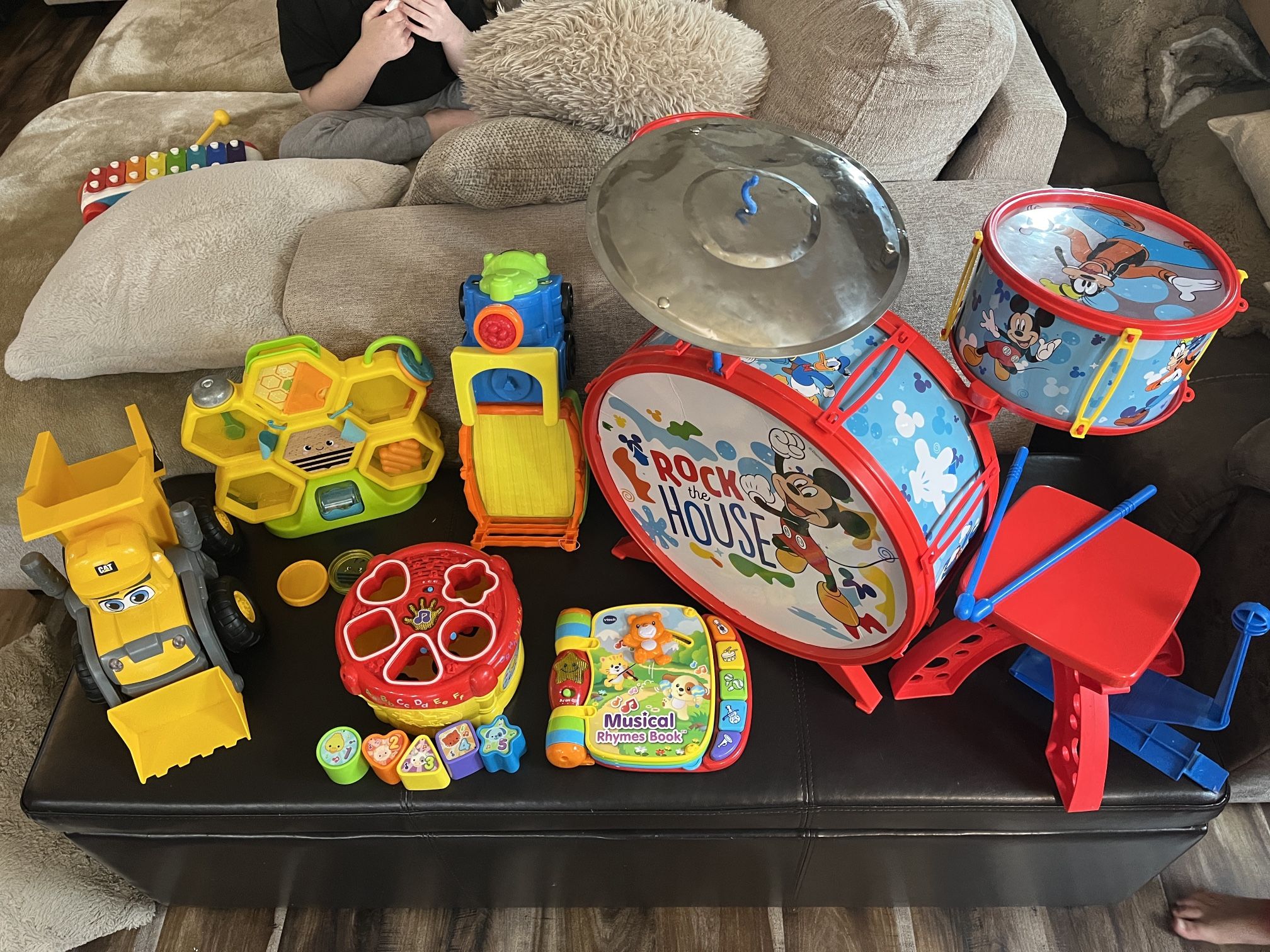 See photos for details on toys. Everything shown works (electrical toys all work) however we are missing Little People for farm tractor and one of the coins for the Fisher Price hive toy. Drum set is functional but could use some finagling to make it more secure (hot glue gun parts together for security)