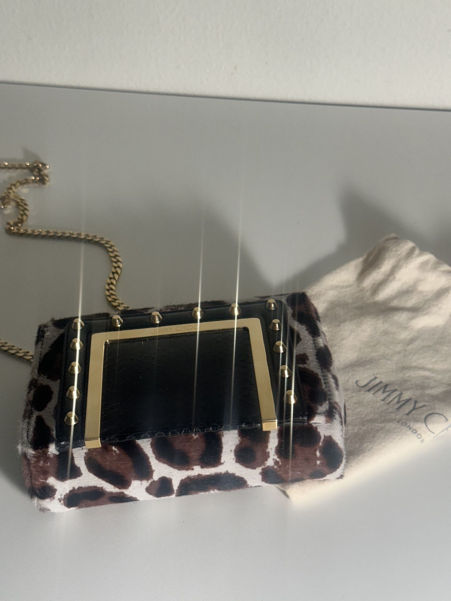 Jimmy Choo Alba Leopard Print Calf Hair Mini Shoulder Bag Black Snakeskin Panel Gold Chain Strap Studs Dust Bag