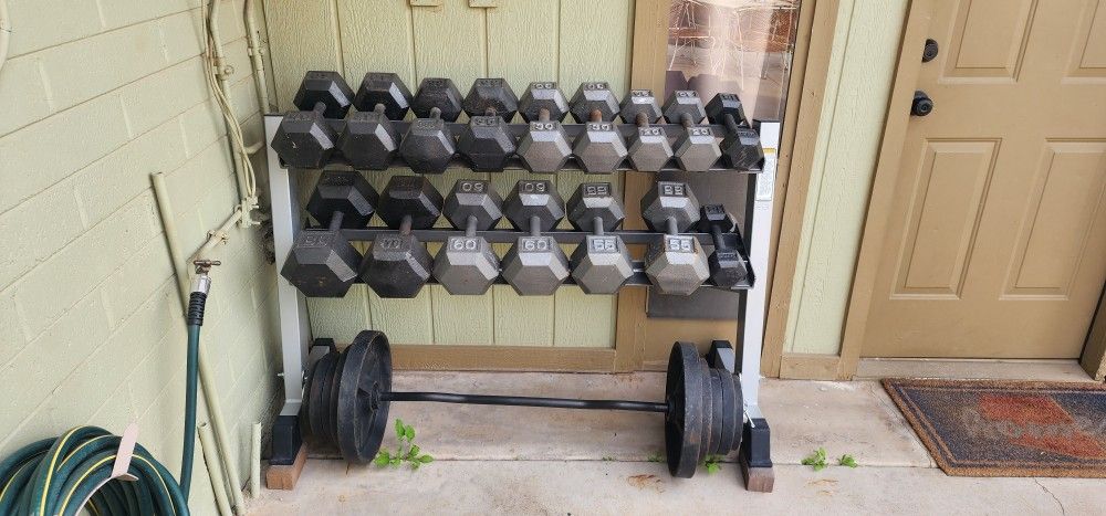 Make me a deal. No low ballers! 865lbs... Plates- 2x35 2x25 4x10 2x5 Dumbells- 2x15 2x20 2x30 2x35 2x40 2x55 2x60 1x70 1x80 EZ Curl bar- 35lbs Clamps- 2x