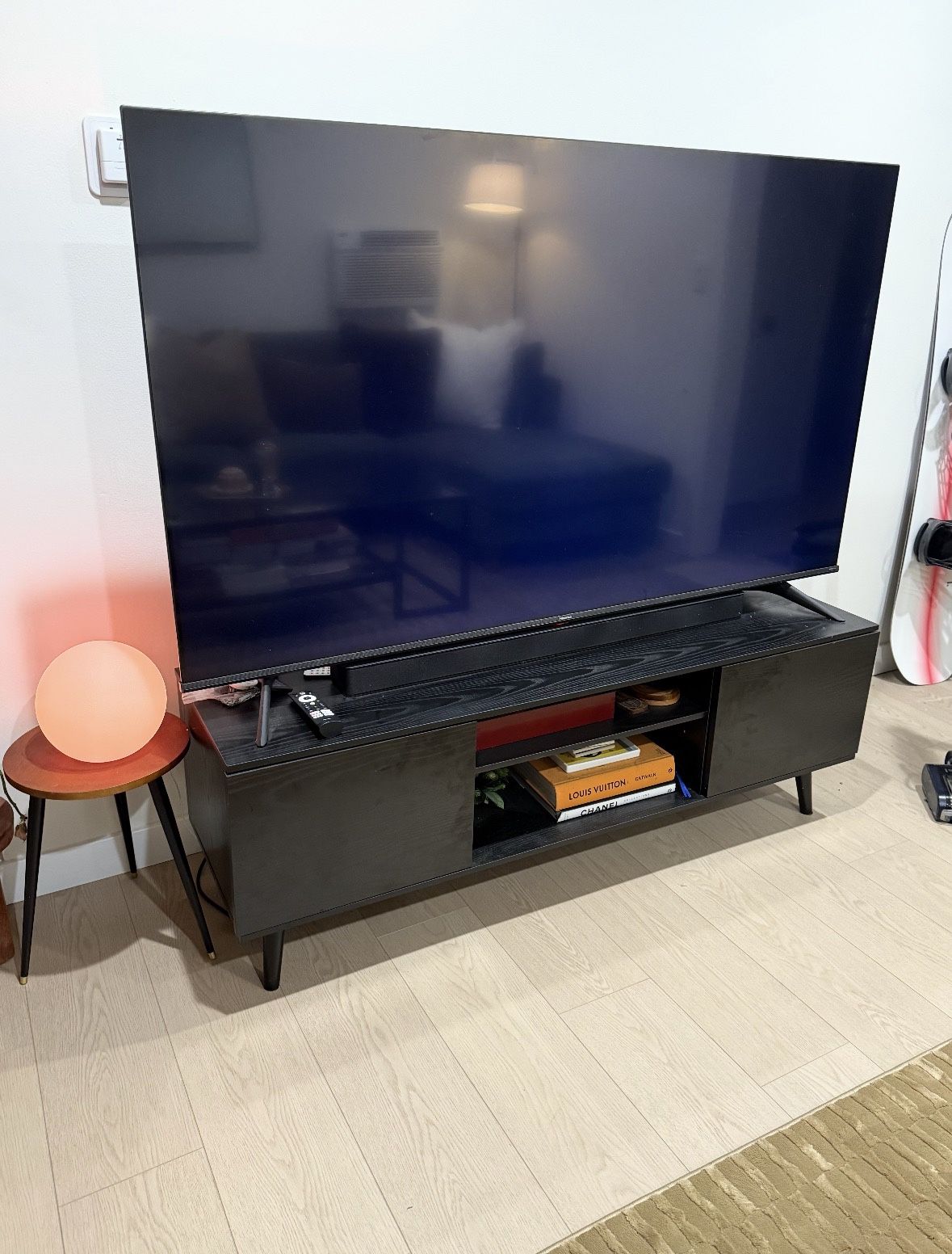 Length: 54 3/8” Depth: 15 3/4” Height: 19” odern black TV stand with a clean, mid-century inspired design. Features two side cabinets with doors and an open center shelf—perfect for media devices, game consoles, or décor. Includes rear cable cutouts for clean wire management. Sturdy construction, doors open and close smoothly, and the finish is in great shape. From a smoke-free home. Fits TVs up to ~60” comfortably. Great for apartments, condos, or anyone looking for a low-profile entertainment console.