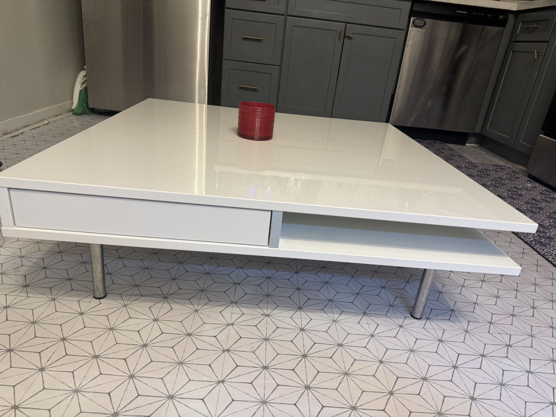 Square white coffee table. 2 touch drawers and 2 open shelves. Minor scratches on the surface of the table, shown in photos. 37.5in x 37.5in. Sample picture for how to style this table in your living room.