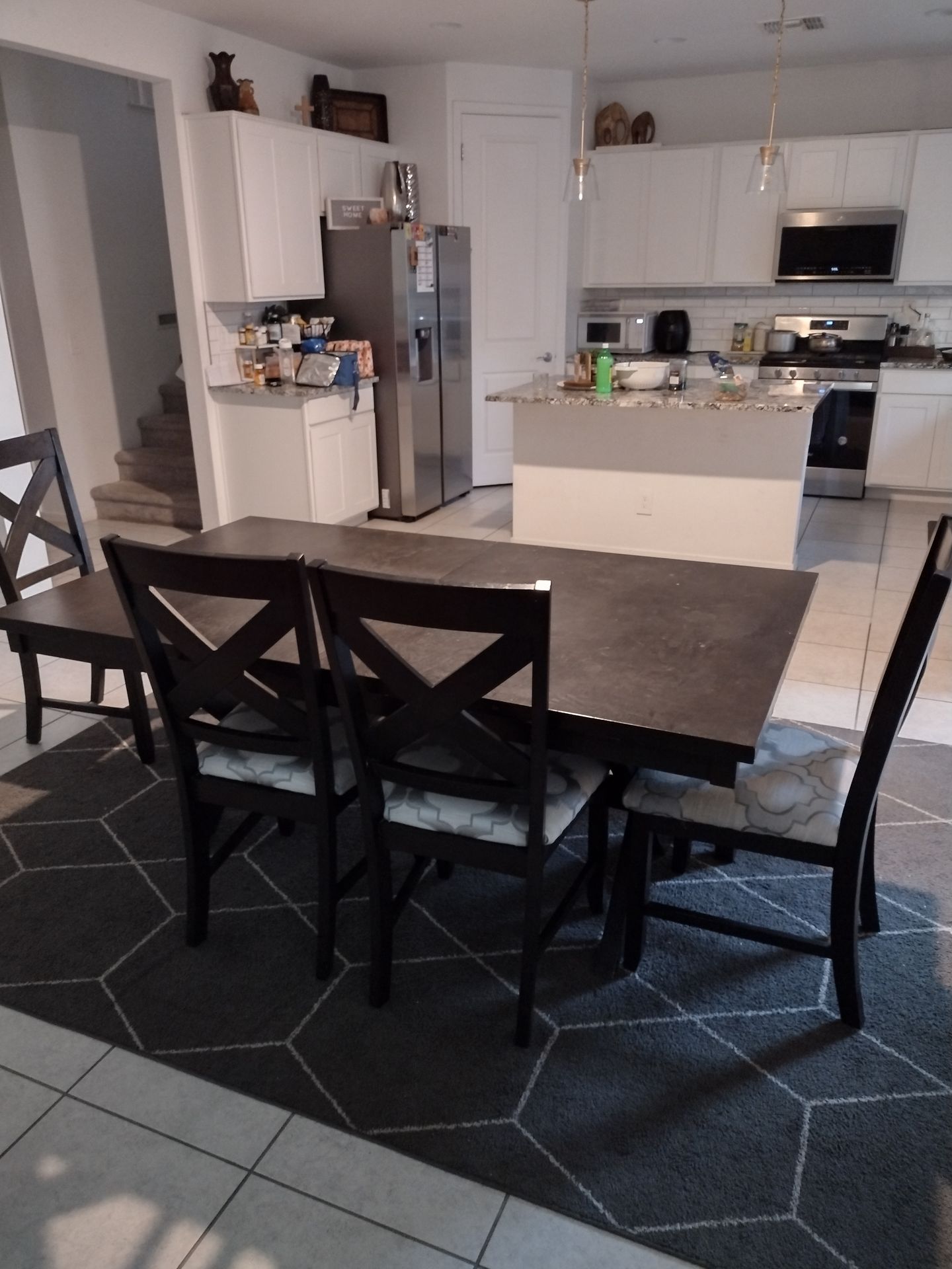 Dinning table set Table 6x4 plus extra adjustable piece 2 feet. 4 Chairs One bench. Used condition.