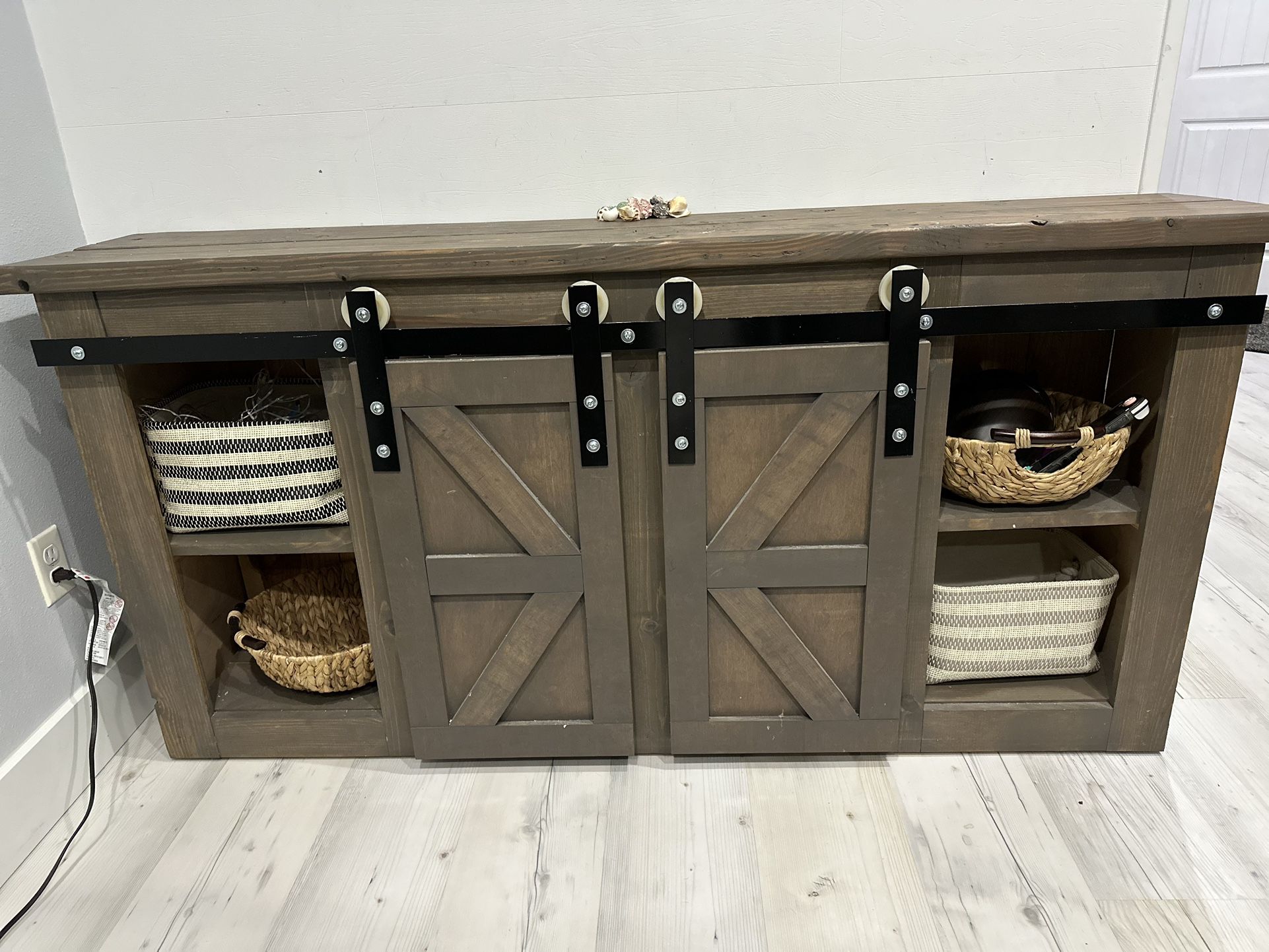 Custom real wood farmhouse style console, buffet, side board, etc. table. Color is the beautiful Briarsmoke stain with polyurethane protection by Varathane. 14.5 inches deep, by 68 inches long, by 33 inches tall. All hand crafted down to the sliding door hardware and the pallet boards accenting the back of the piece. Amazingly versatile but also slim enough to complement your living space. Pick up in West Hill Kent today! Also able to deliver for a fee.