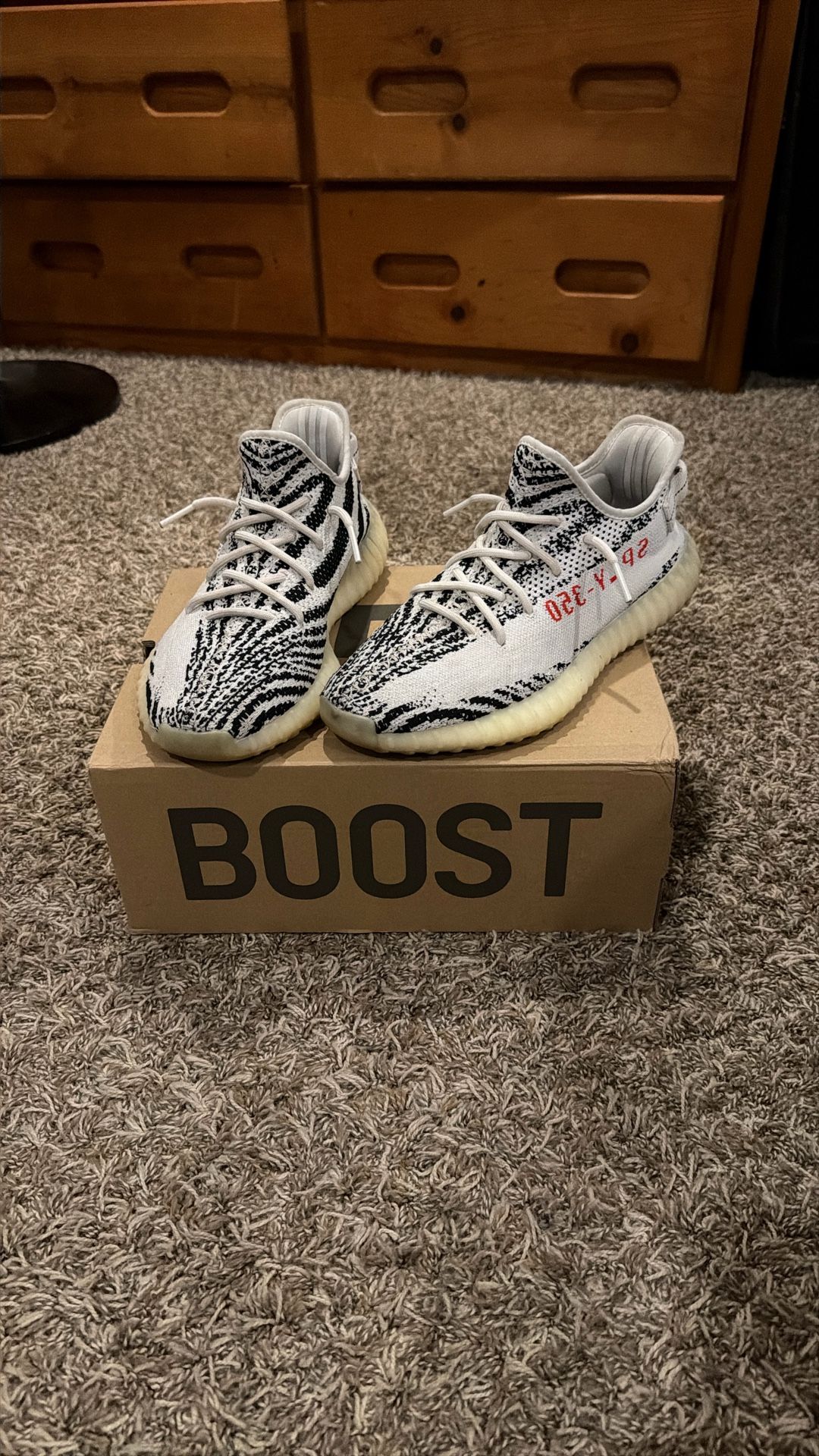 Selling my Yeezy 350 V2 Zebras, size 10. They’re used but in excellent, almost-new condition. The only flaw is that the insoles are dirty, but everything else is very clean with no major creases or damage. Boost still feels great. Overall, they look close to new and have plenty of life left. Price: $300 CASH ONLY Message me if you want more pics or details!