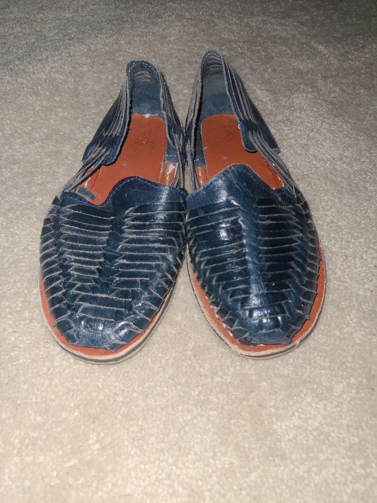 100% genuine leather sandals. Wore 1 time. Blue with brown bottoms.