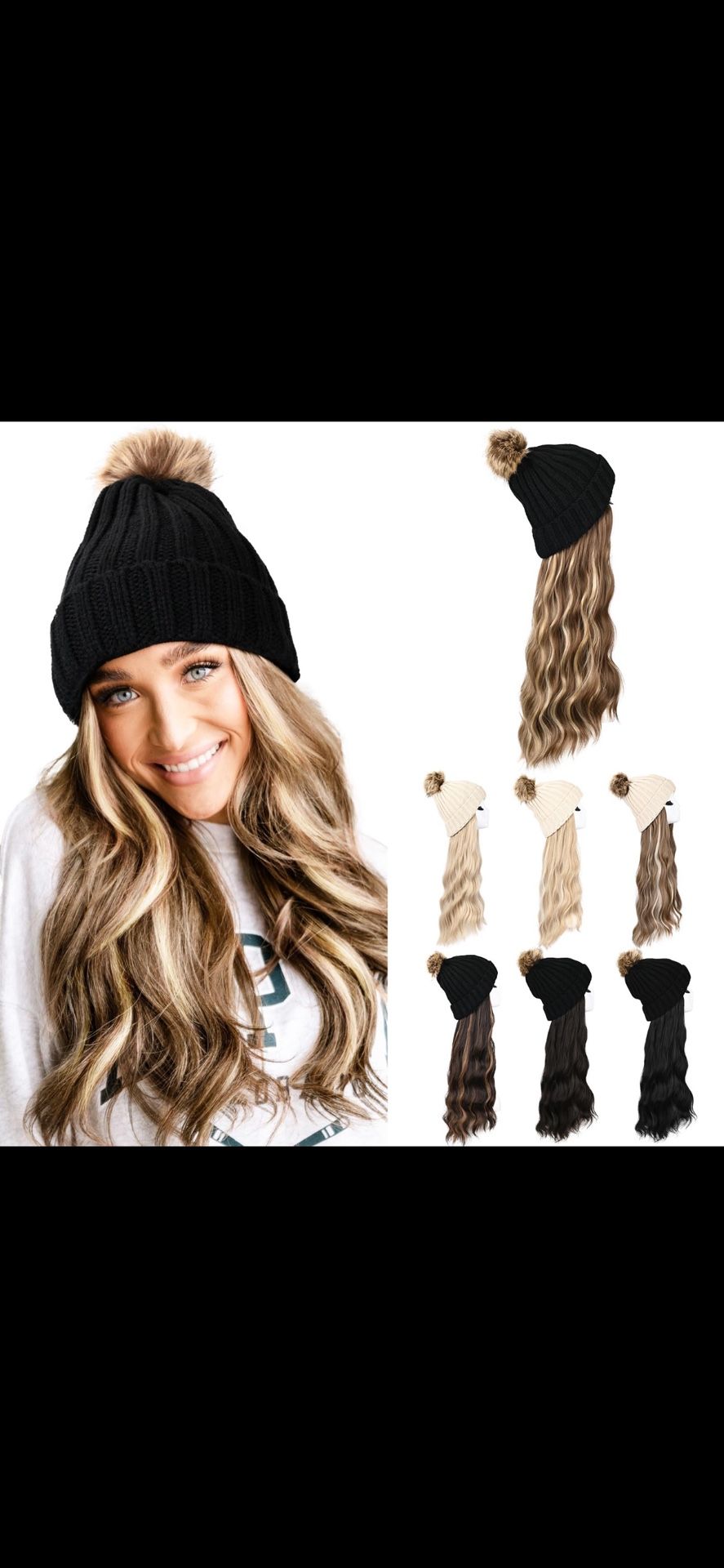 Hat Hair Extension Long Wavy Curly Black Hat Wig With Faux Fur Pom Hat Attached 18 Inch Synthetic Hairpiece For Women