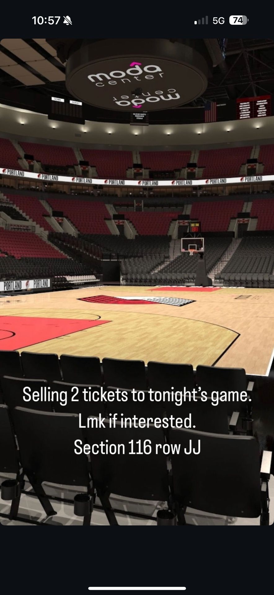 Selling 2 tickets to Blazers vs 76ers tonight. Section 116 row JJ. $290 for the set.